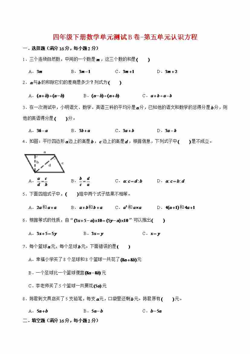【单元AB卷】四年级下册数学单元测试B卷-第五单元认识方程 北师大版(含答案)