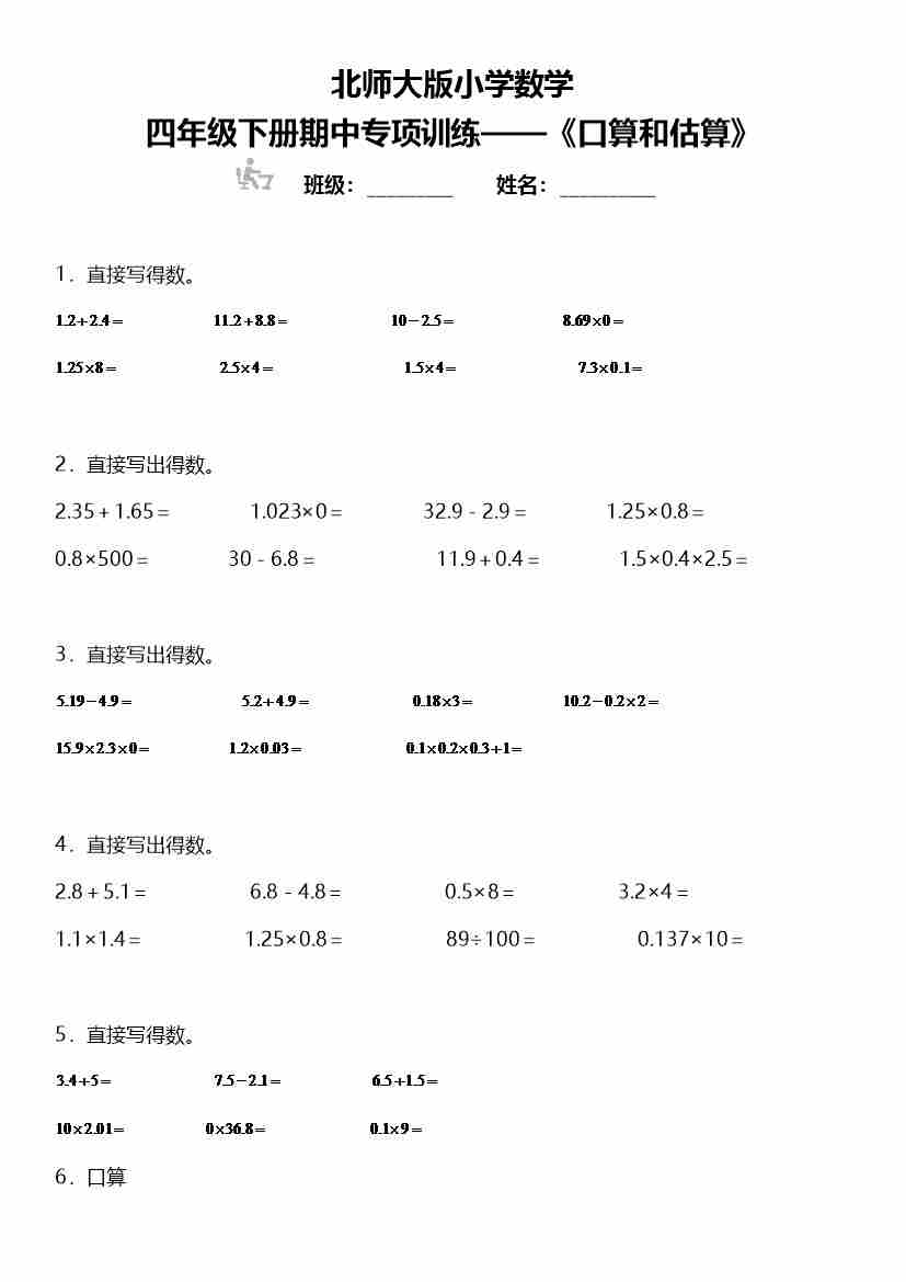 四年级下册数学 期中复习专项训练 《口算和估算》 北师大版