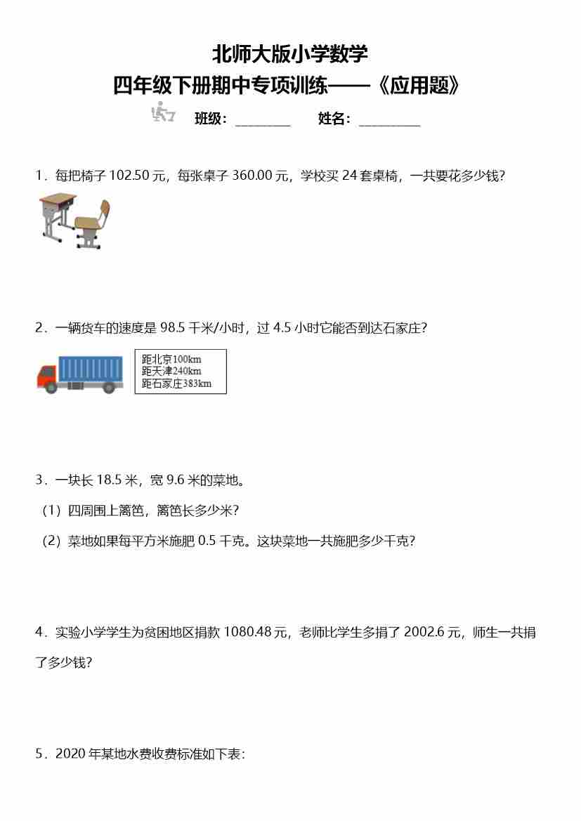 四年级下册数学 期中复习专项训练 《应用题》 北师大版