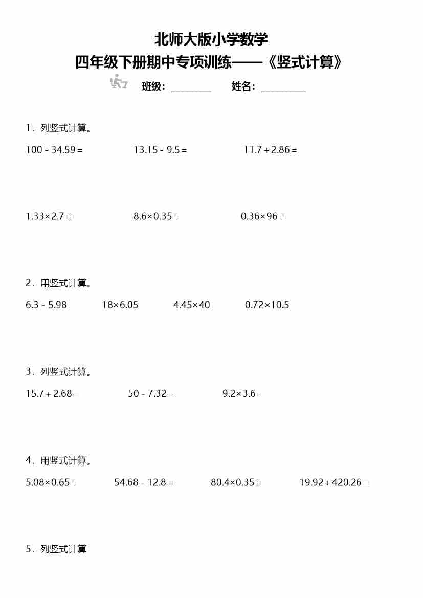 四年级下册数学 期中复习专项训练 《竖式计算》 北师大版