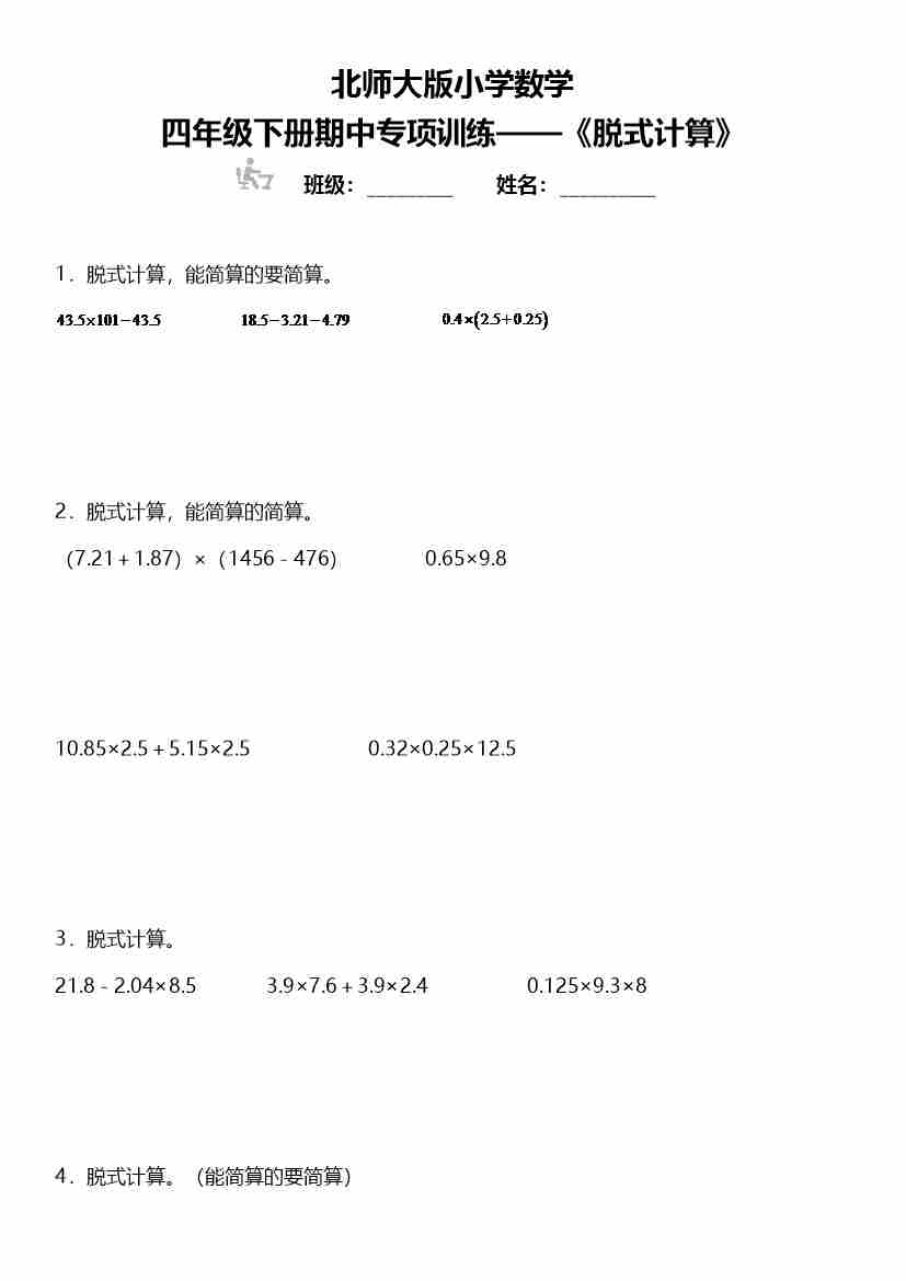 四年级下册数学 期中复习专项训练 《脱式计算》 北师大版