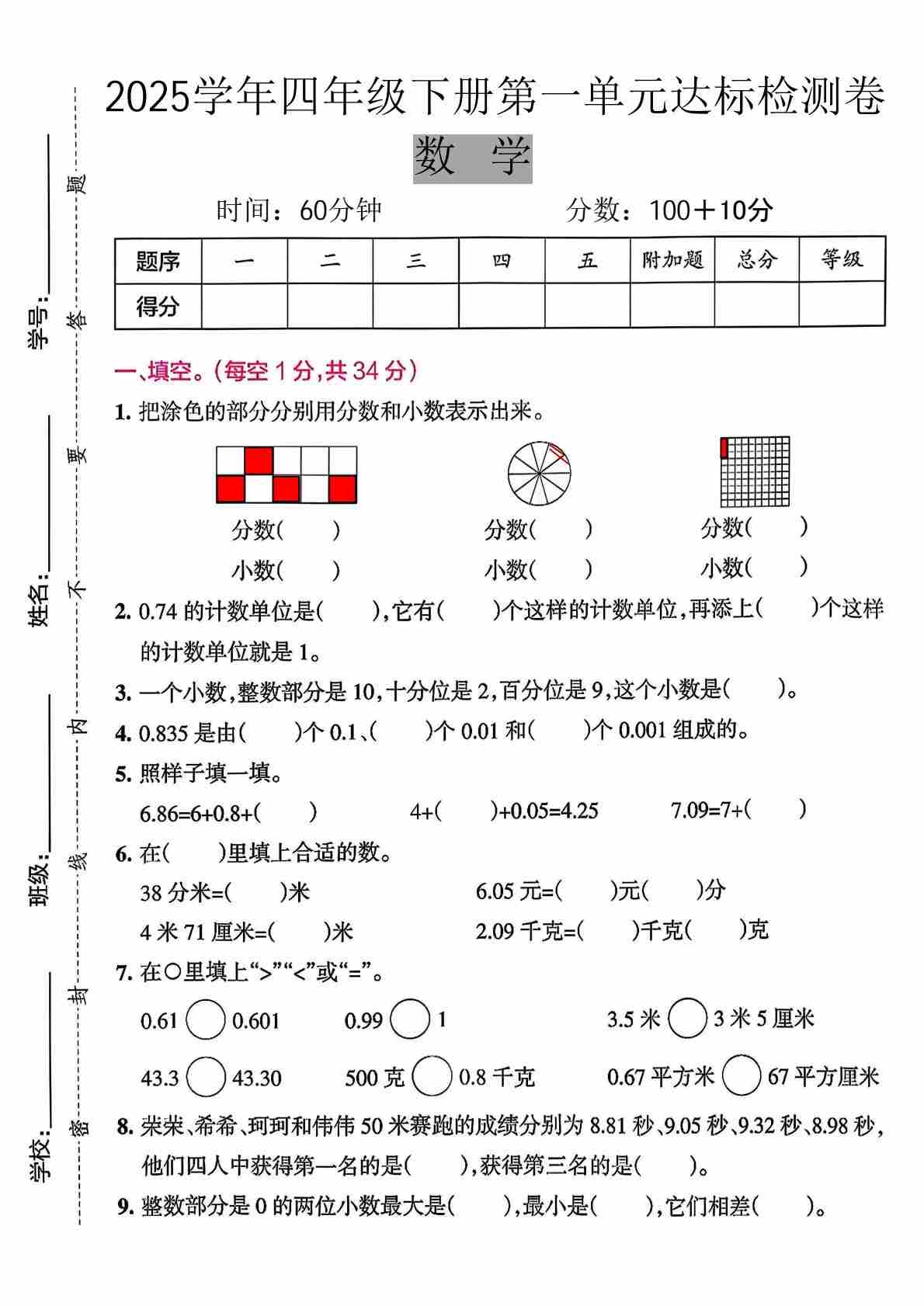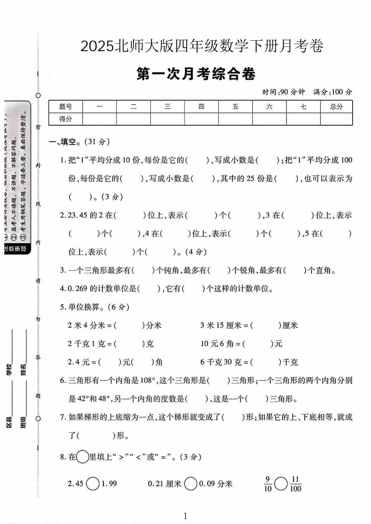 四(下)数学北师版2025四年级下册数学第一次月考卷