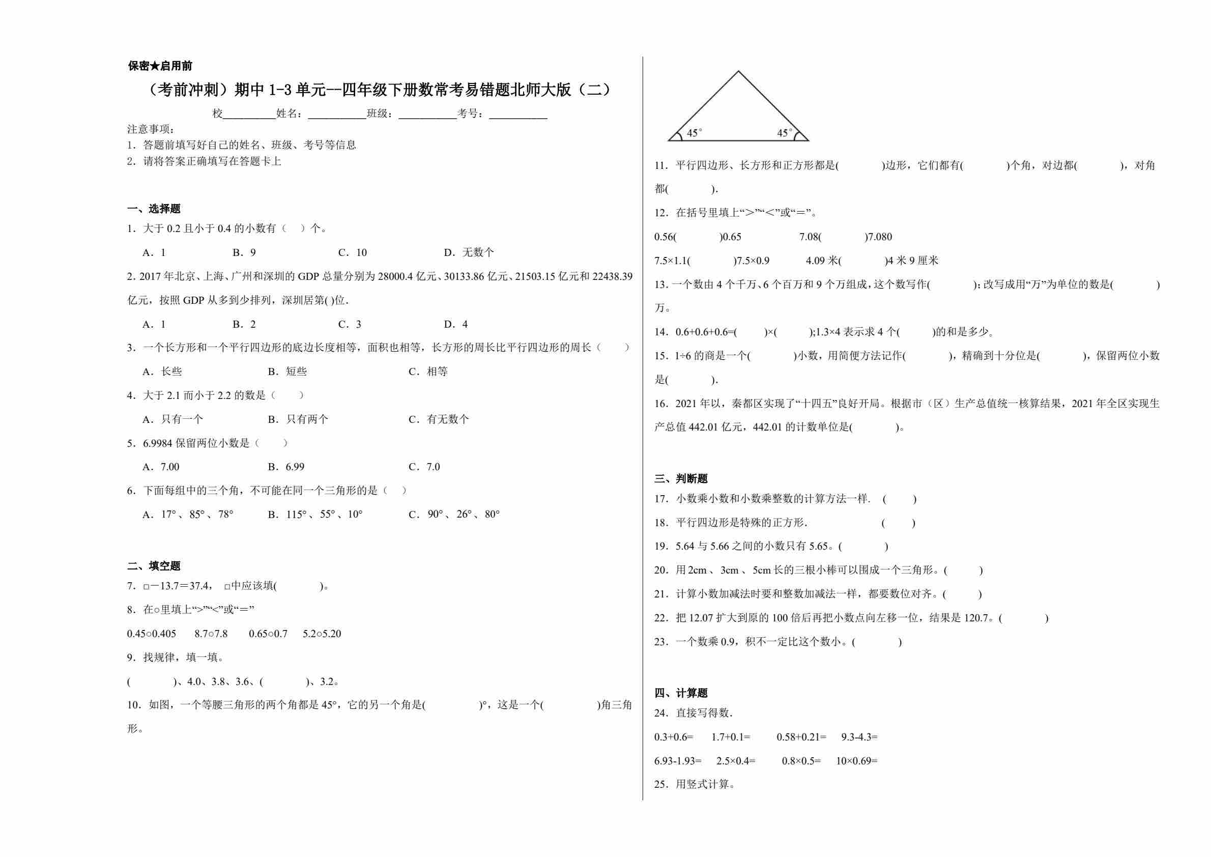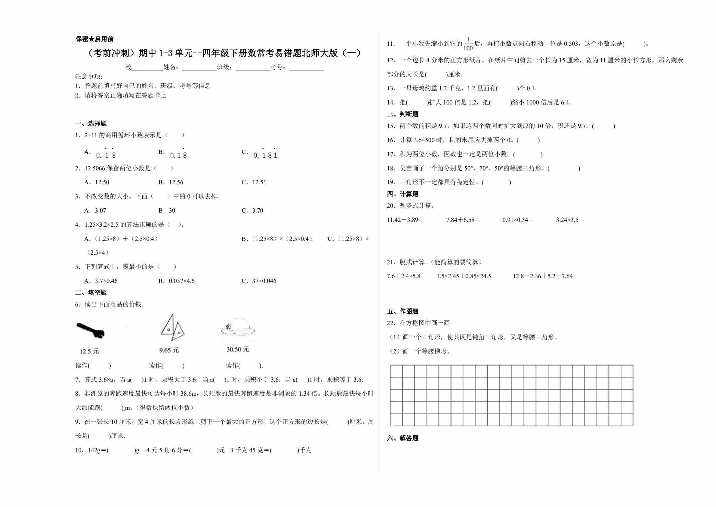 四(下)数学【北师版】(考前冲刺)期中1-3单元--常考易错题