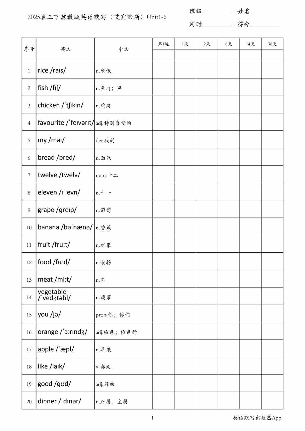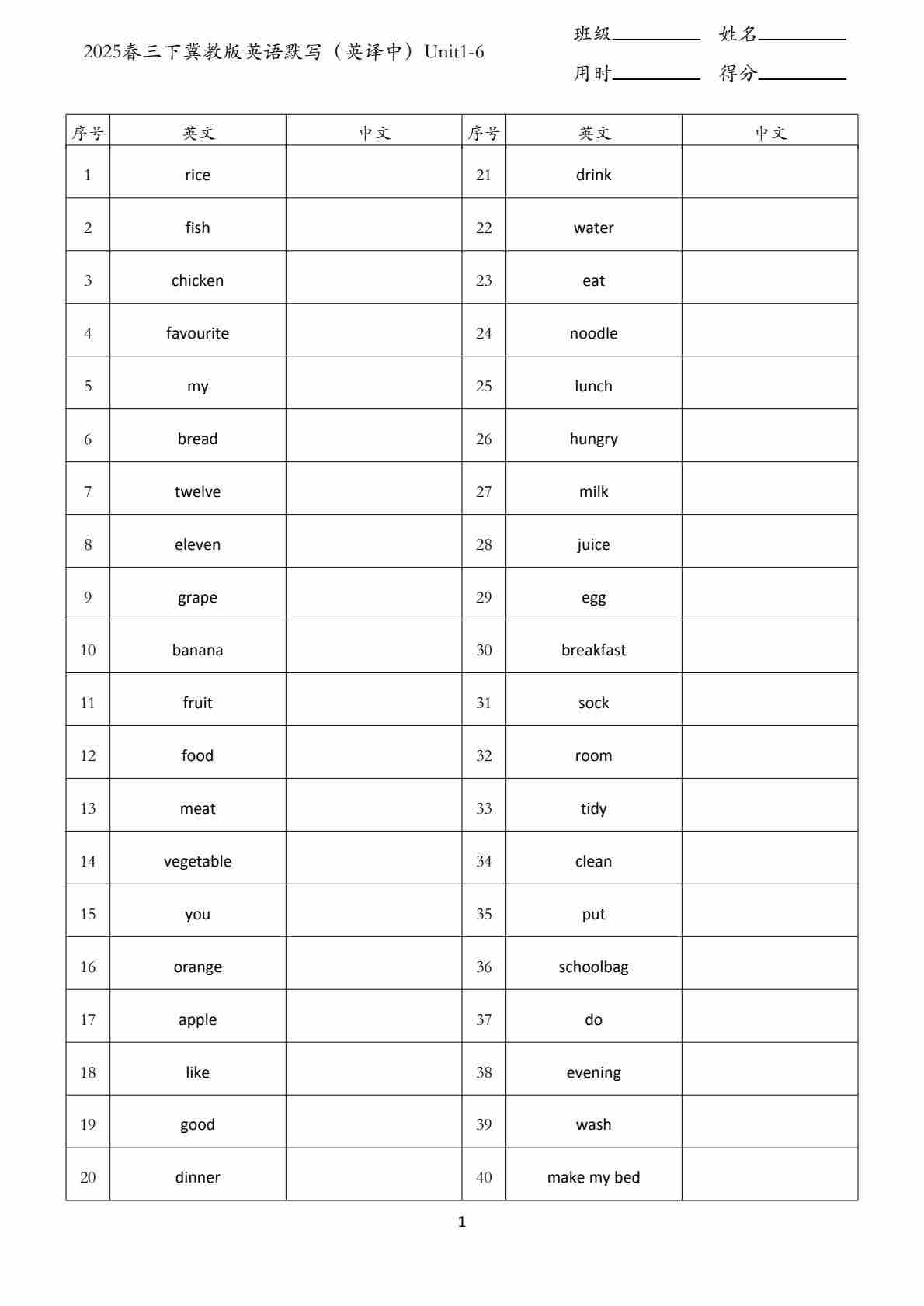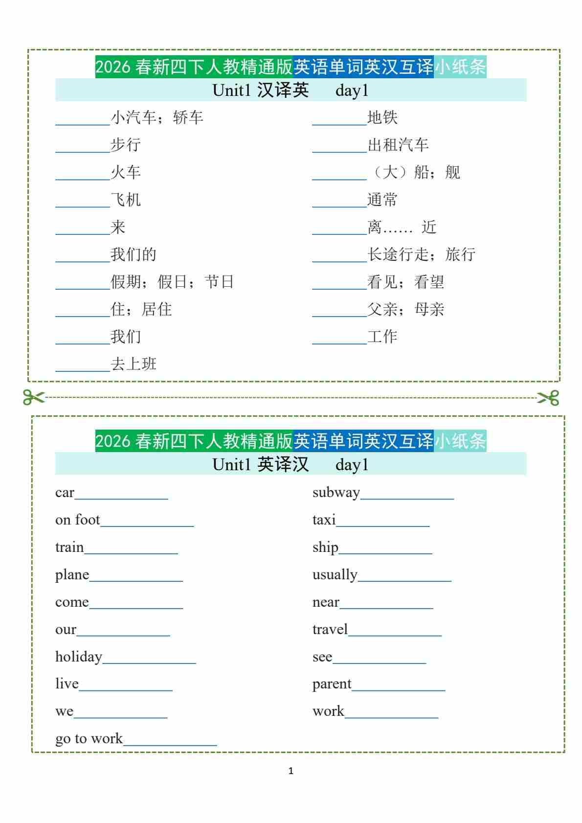 25春四年级下册人教精通版英语单词英汉互译小纸条_