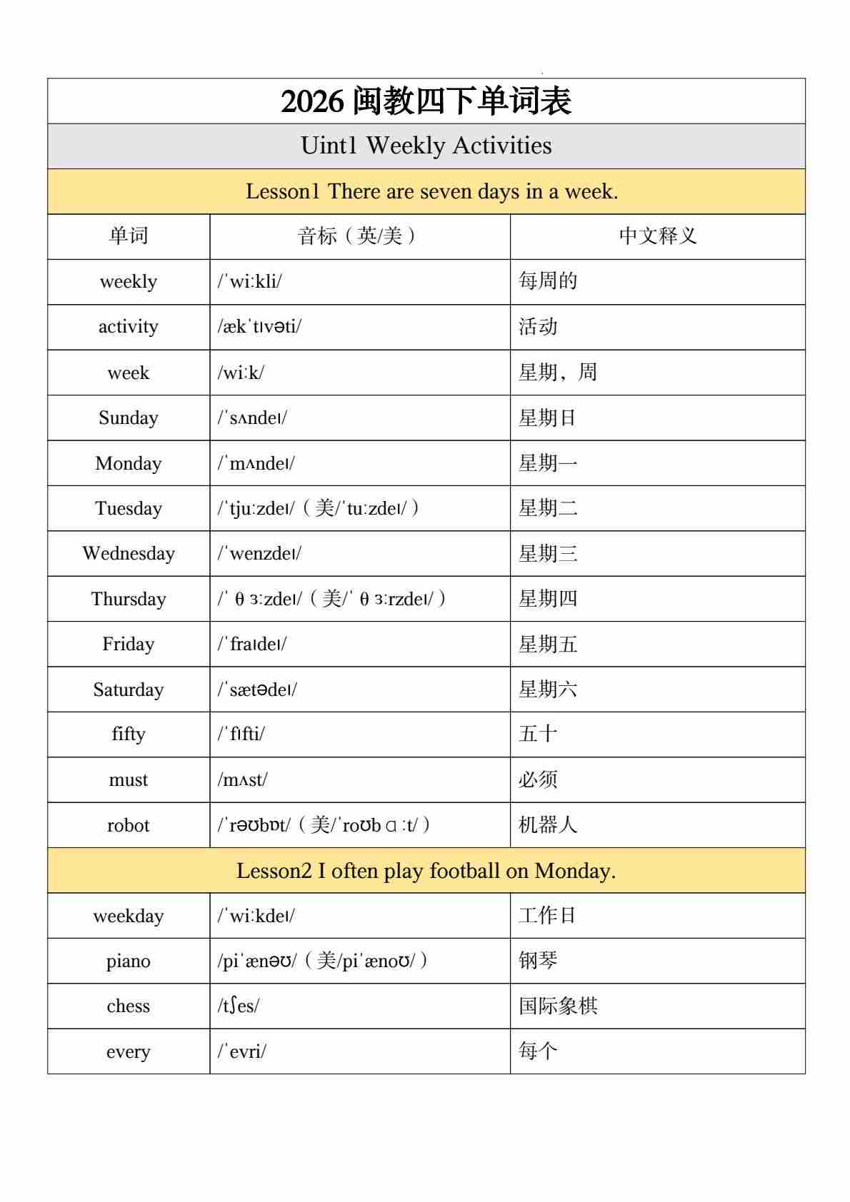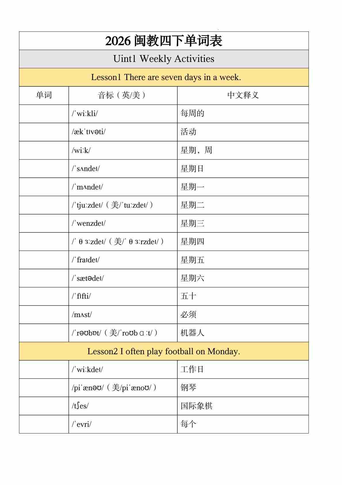 26春四下闽教版单词短语句型晨读晚默小纸条_