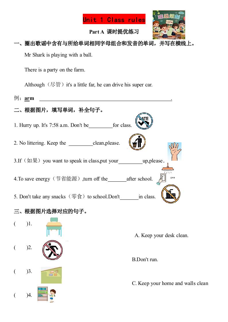 Unit 1 Class rules Part A 提优练习(含参考答案)人教新版(PEP)四年级下册