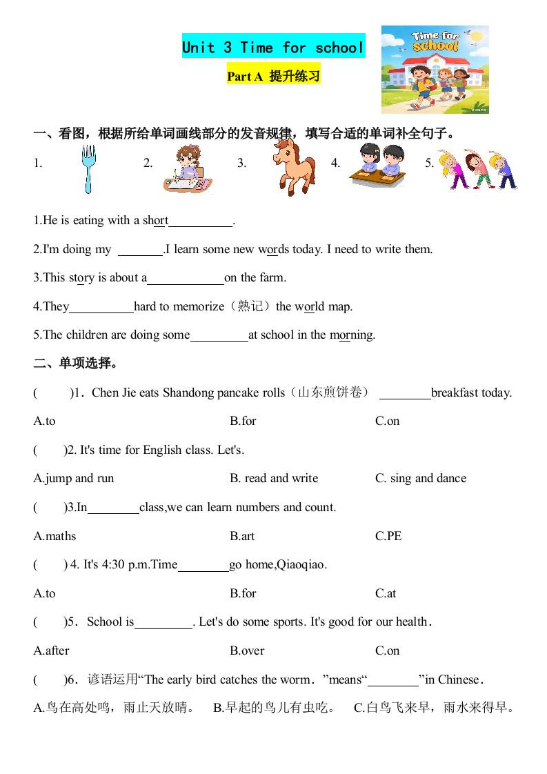 Unit 3 Time for school Part A 提优练习(含参考答案)人教新版(PEP)四年级下册