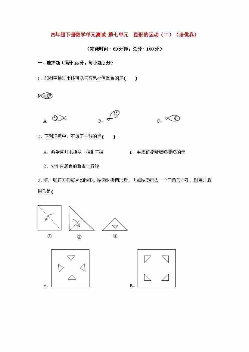 【分层训练】四年级下册数学单元测试-第七单元 图形的运动(二)(培优卷) 人教版(含答案)