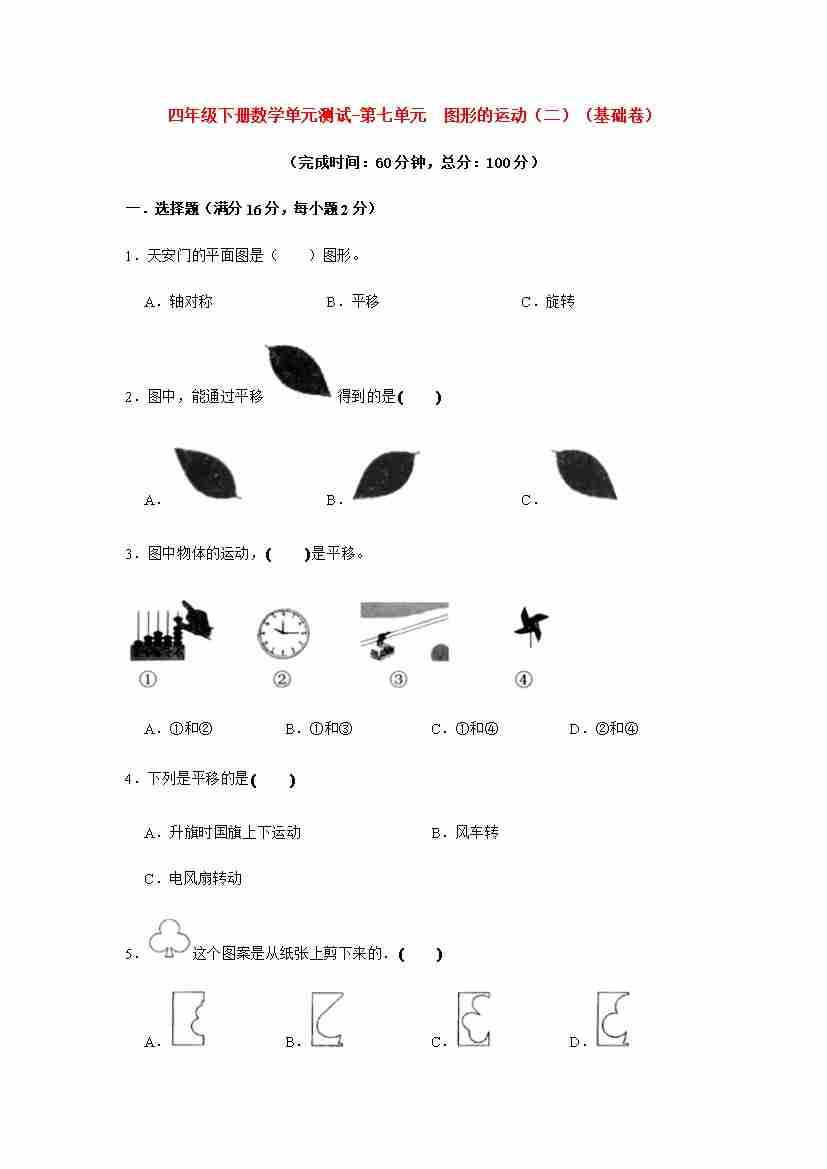 【分层训练】四年级下册数学单元测试-第七单元 图形的运动(二)(基础卷) 人教版(含答案)