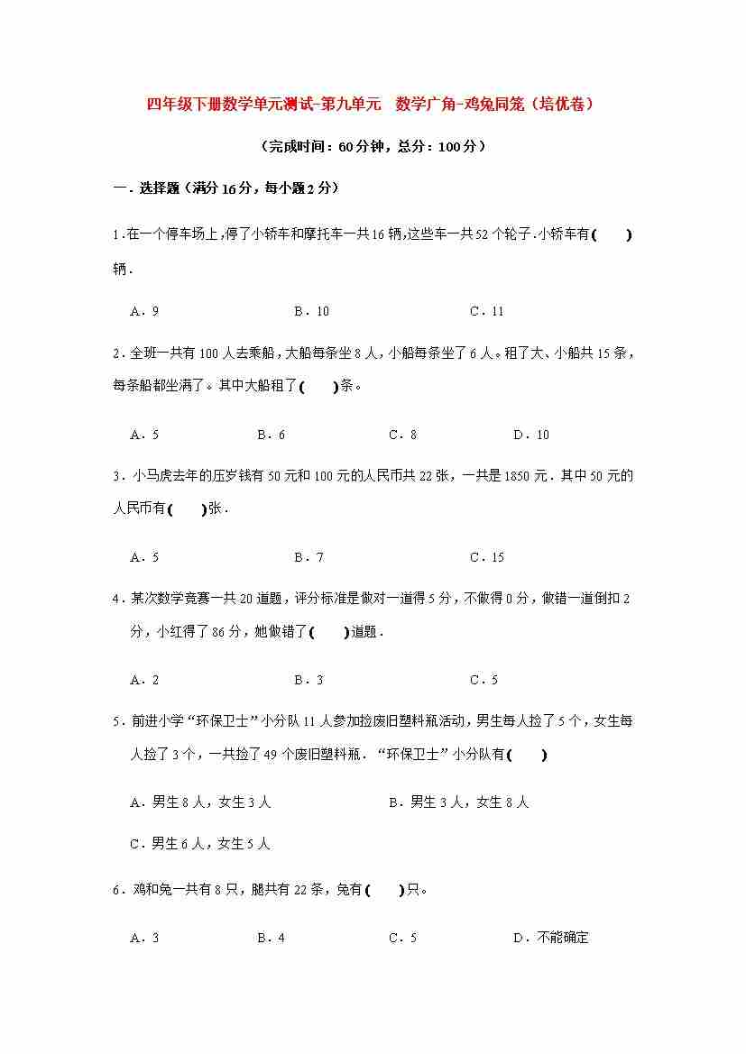 【分层训练】四年级下册数学单元测试-第九单元 数学广角-鸡兔同笼(培优卷) 人教版(含答案)