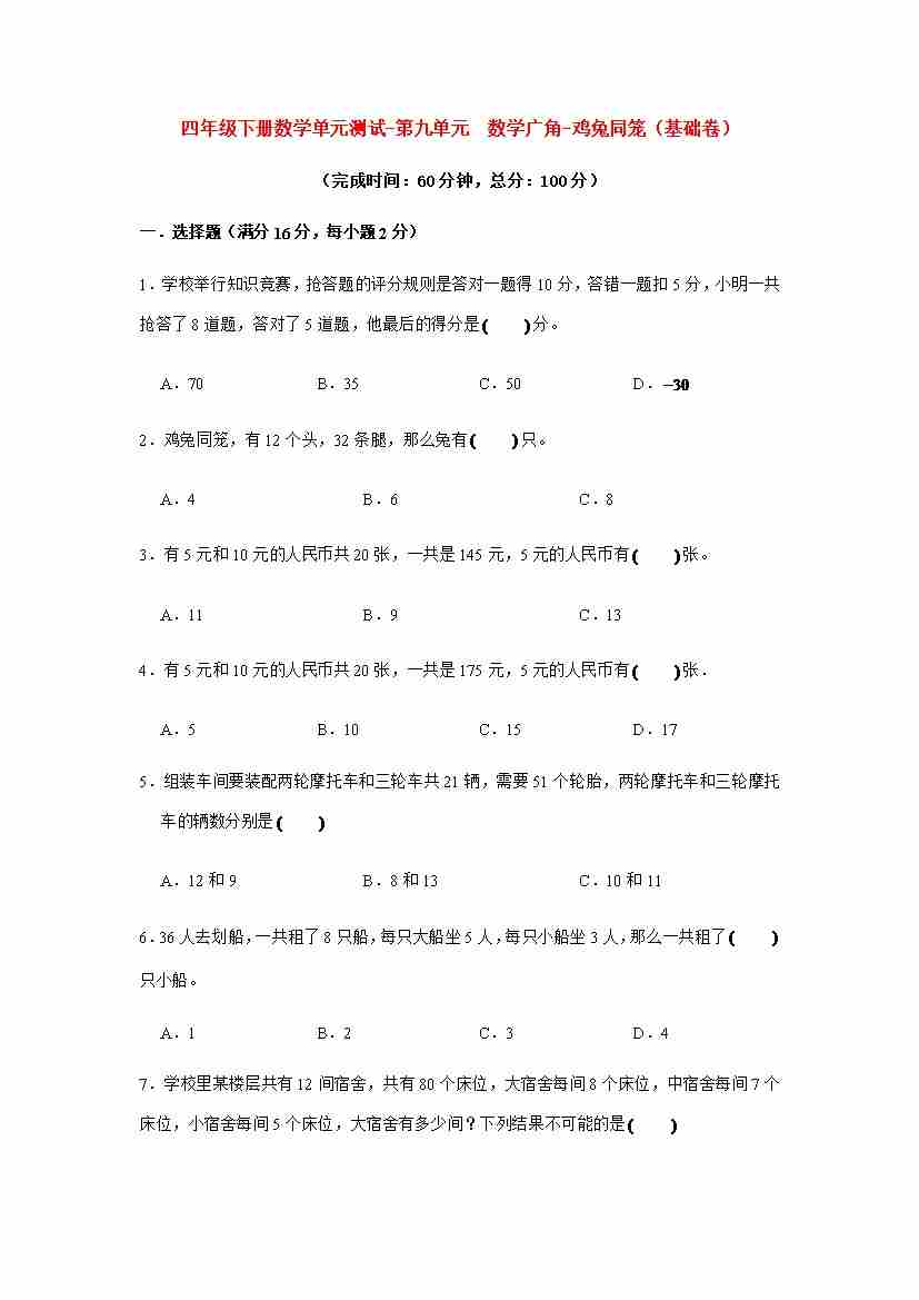【分层训练】四年级下册数学单元测试-第九单元 数学广角-鸡兔同笼(基础卷) 人教版(含答案)