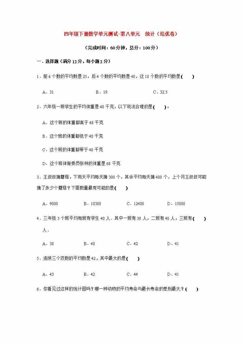 【分层训练】四年级下册数学单元测试-第八单元 统计(培优卷) 人教版(含答案)