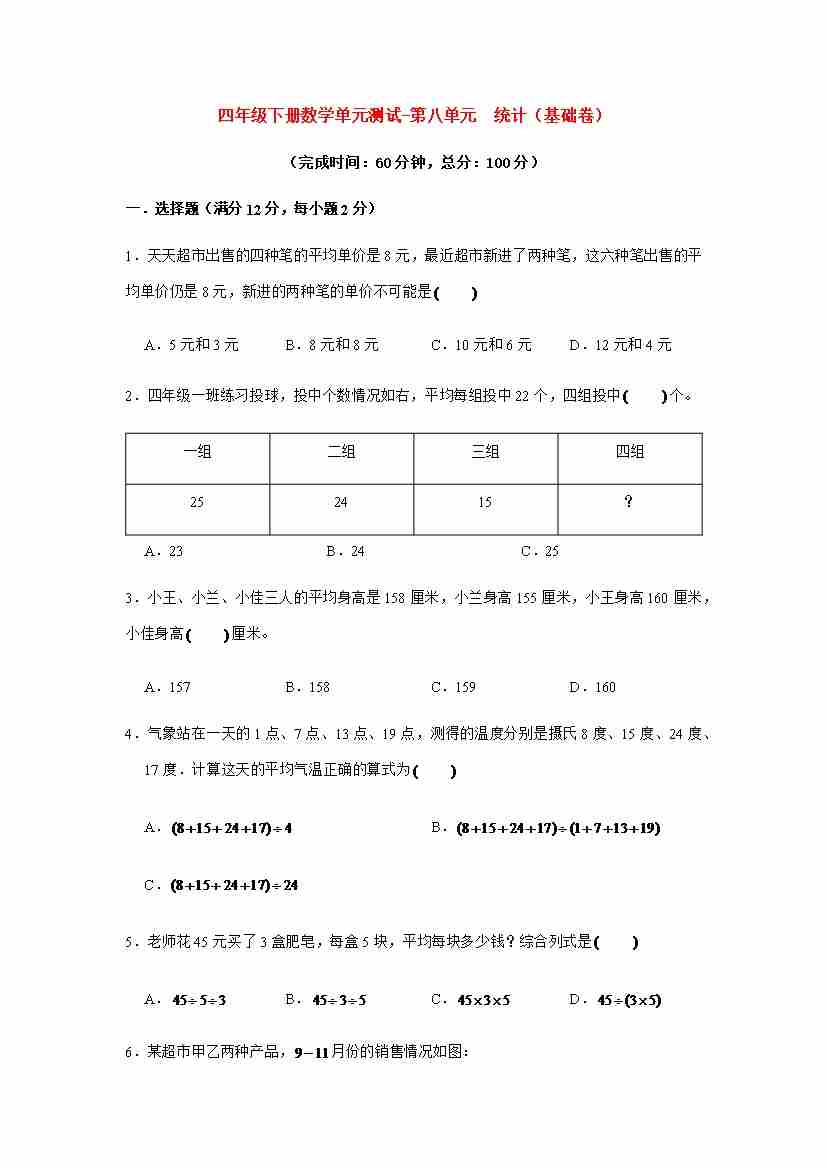 【分层训练】四年级下册数学单元测试-第八单元 统计(基础卷) 人教版(含答案)