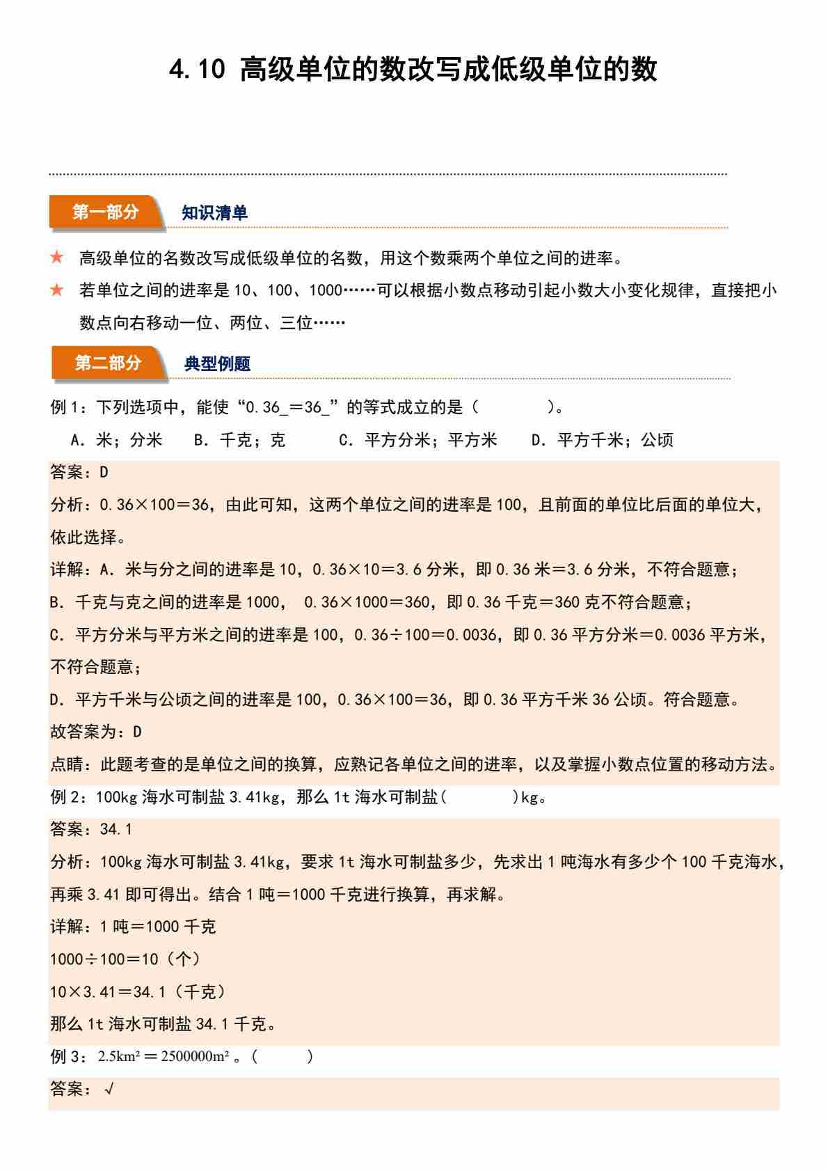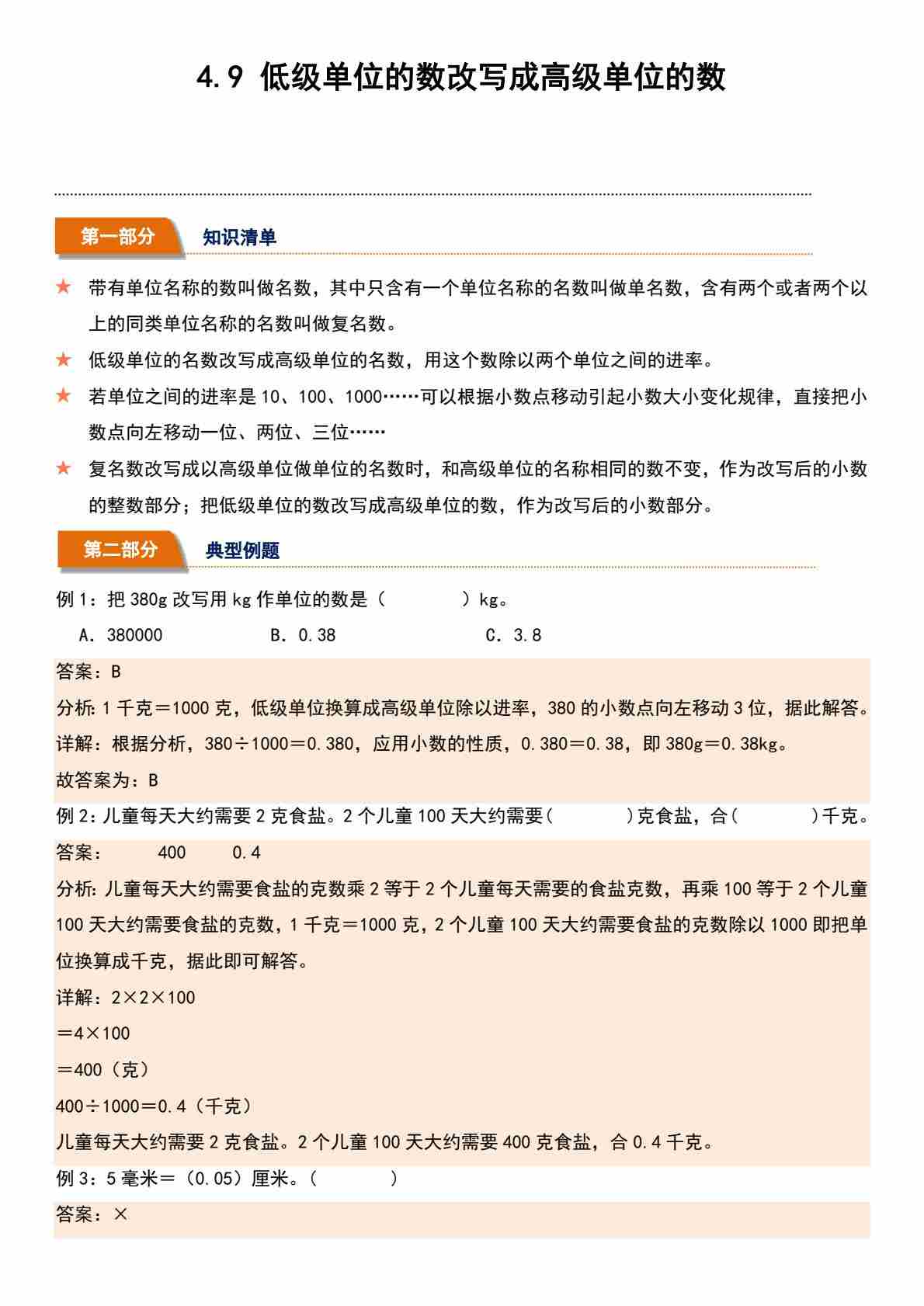 4.9 低级单位的数改写成高级单位的数(分层作业)