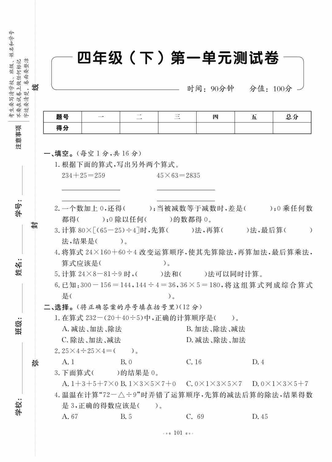 四(下)数学人教版《天天测试100分》