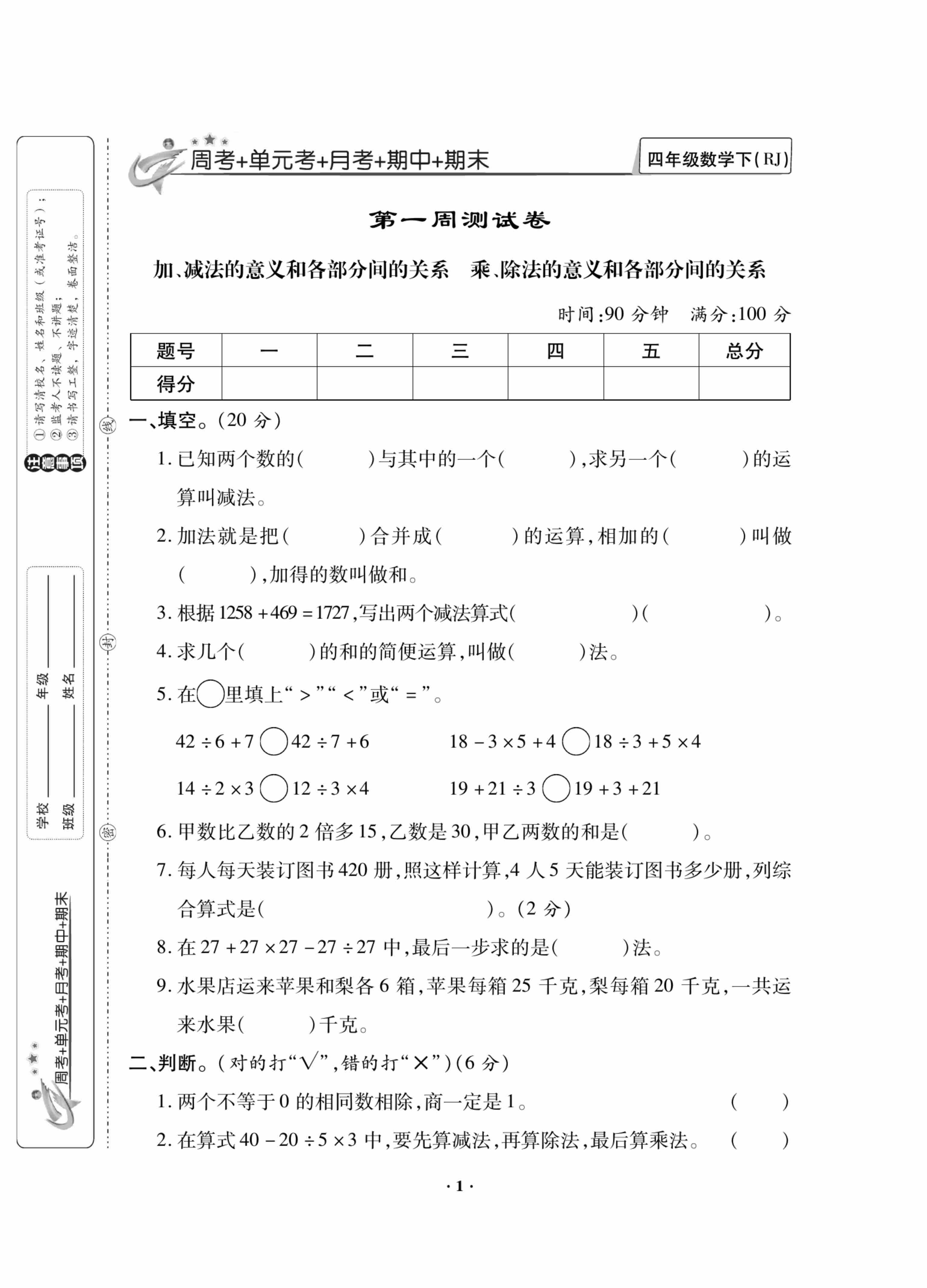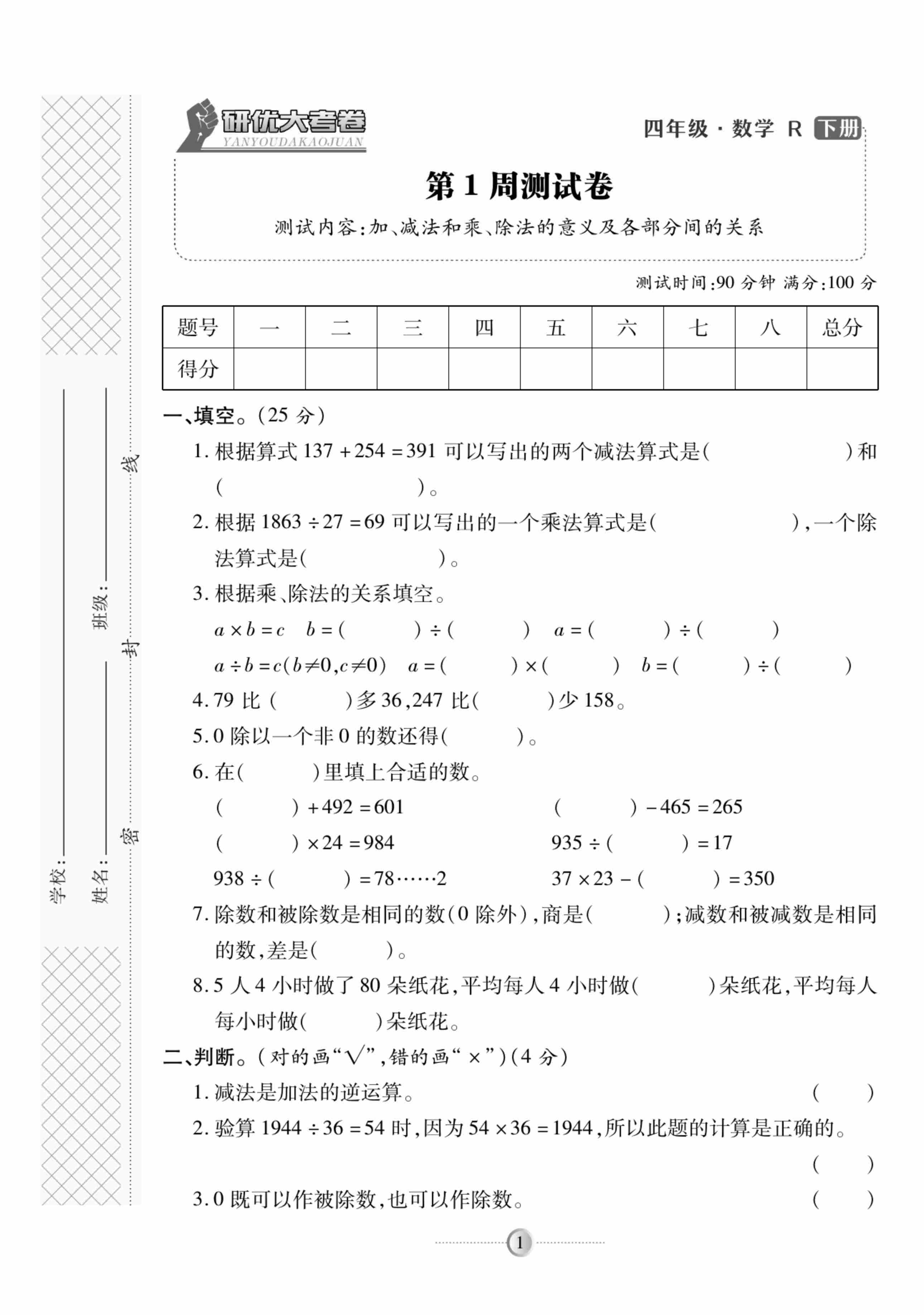 四(下)数学人教版【活页试卷1+1】