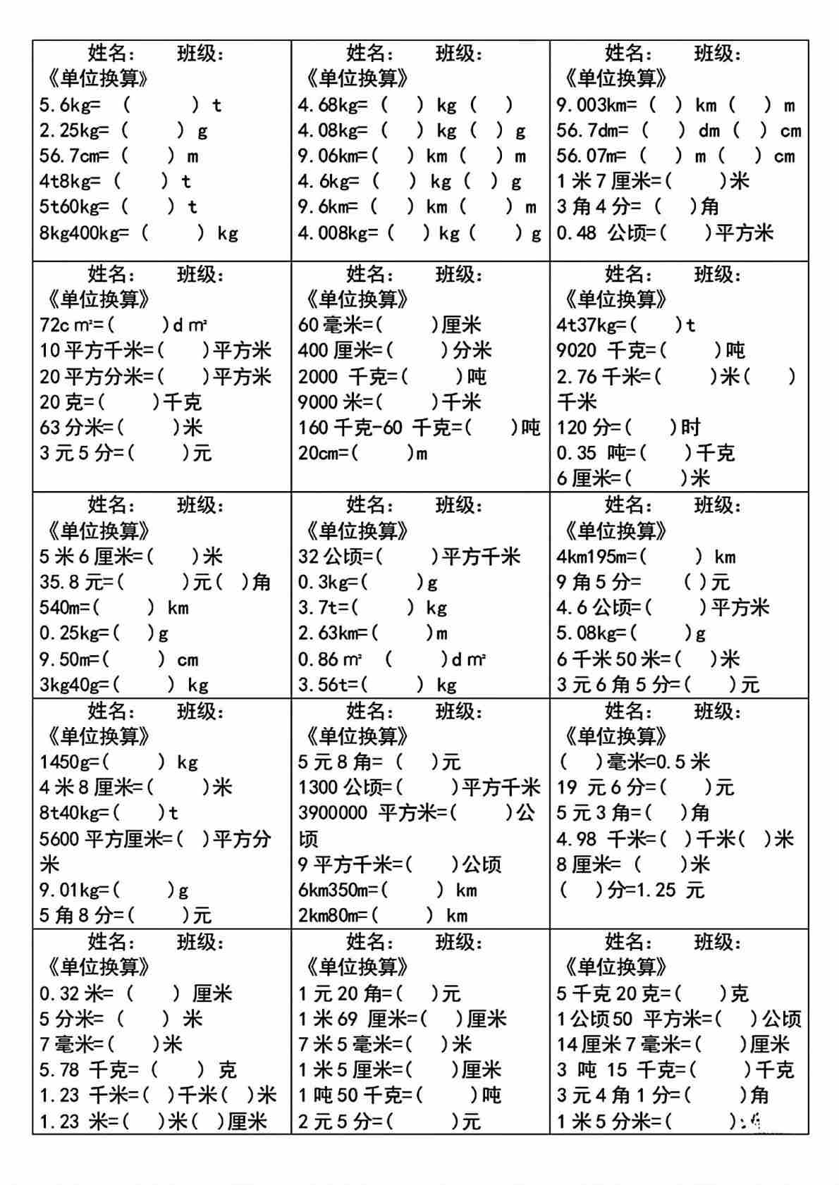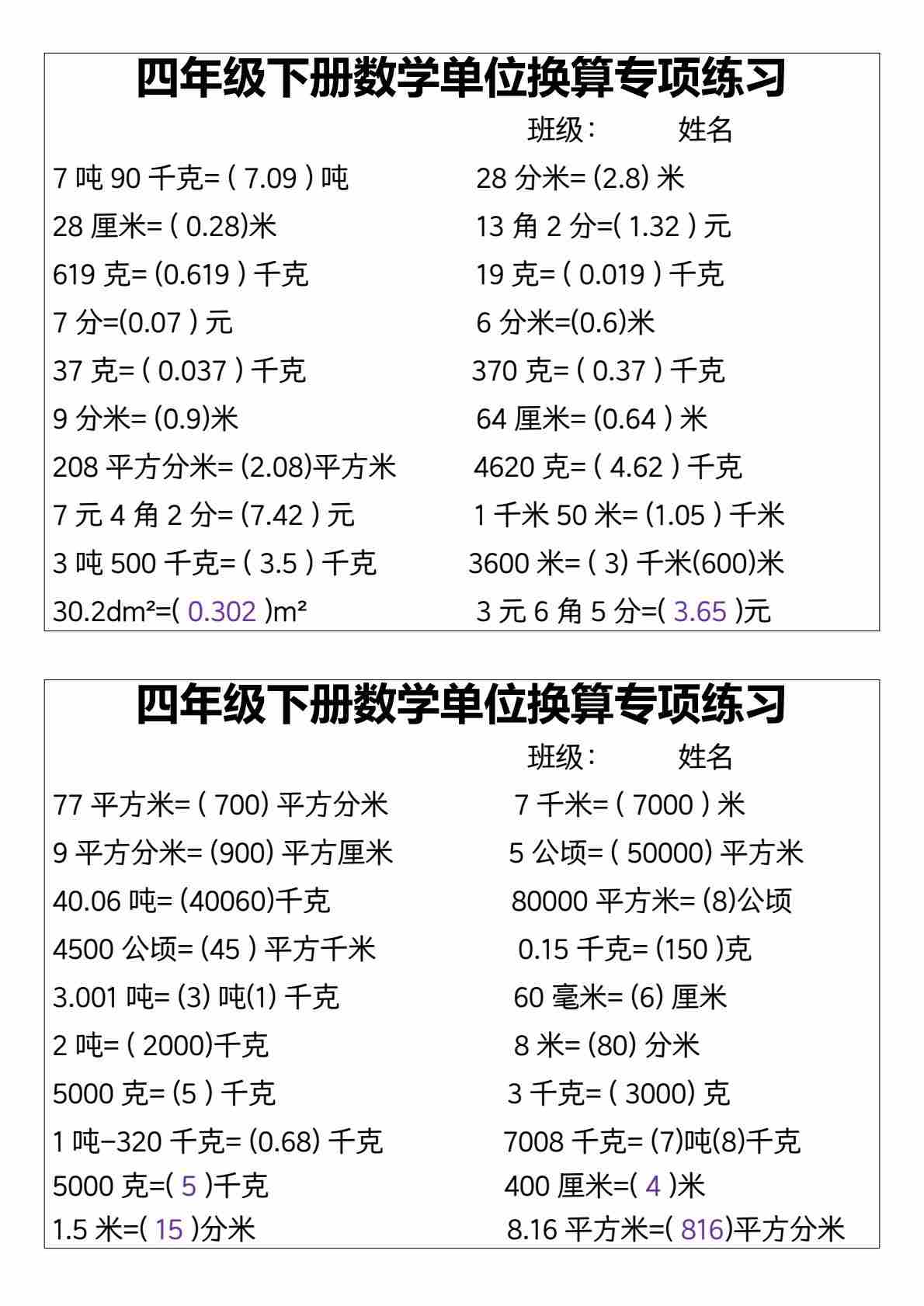 四(下)数学单位换算专项练习