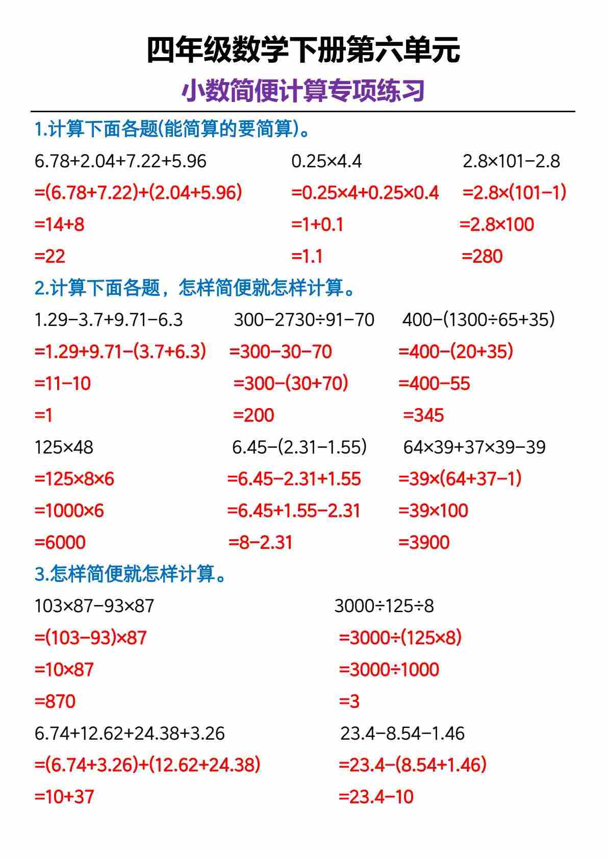四(下)数学第六单元小数简便运算