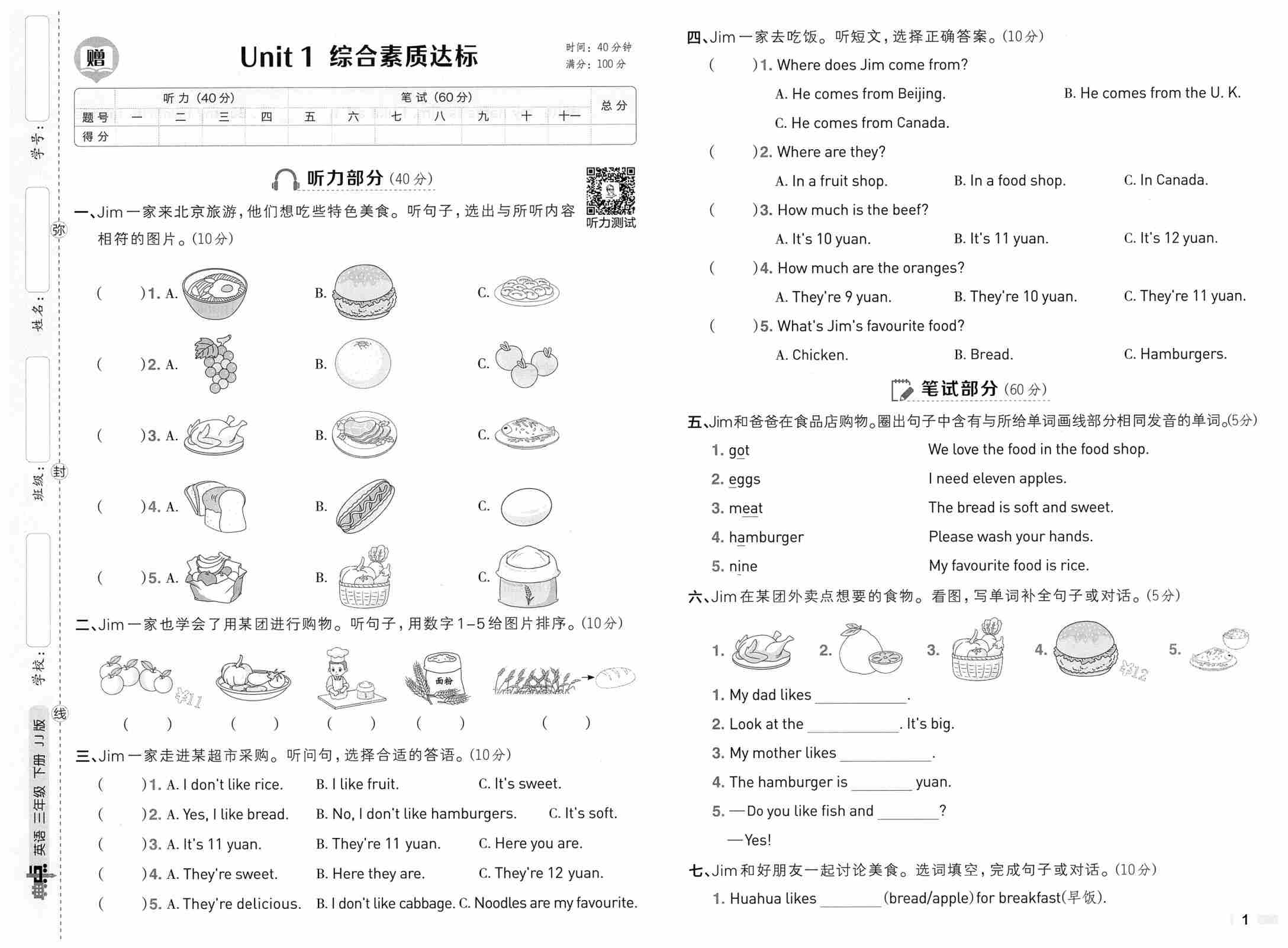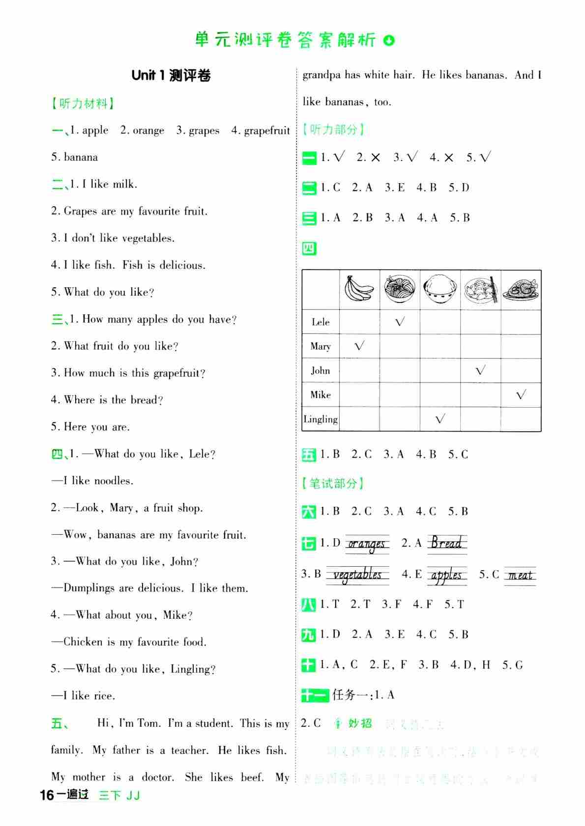 三下英语单元期中期末测评卷-答案