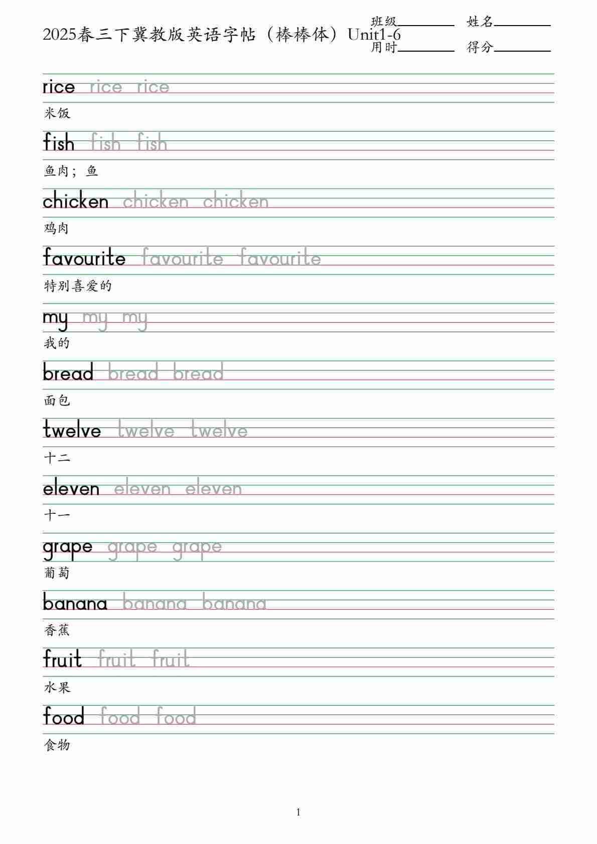 三下冀教字帖(木棍体)Unit1-6