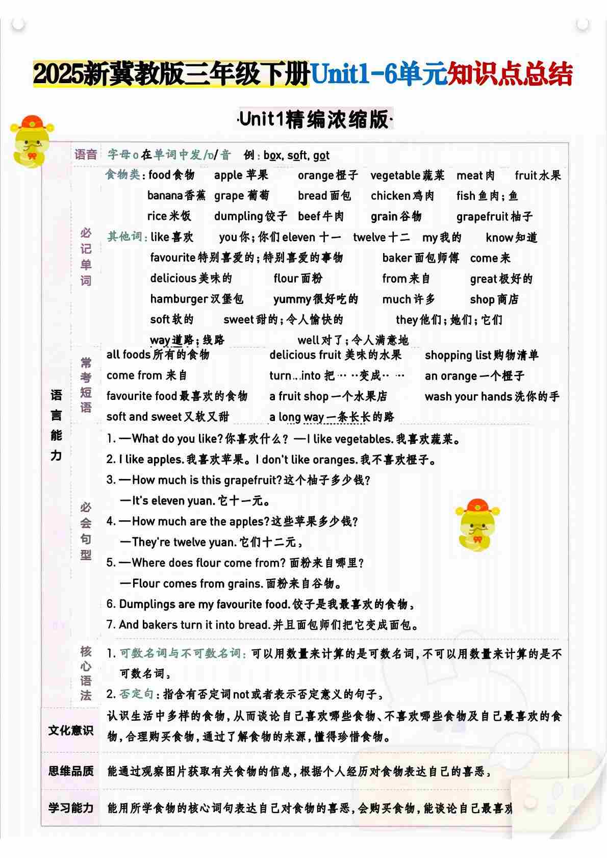 三(下)冀教版英语【2025春-1-6单元知识点】
