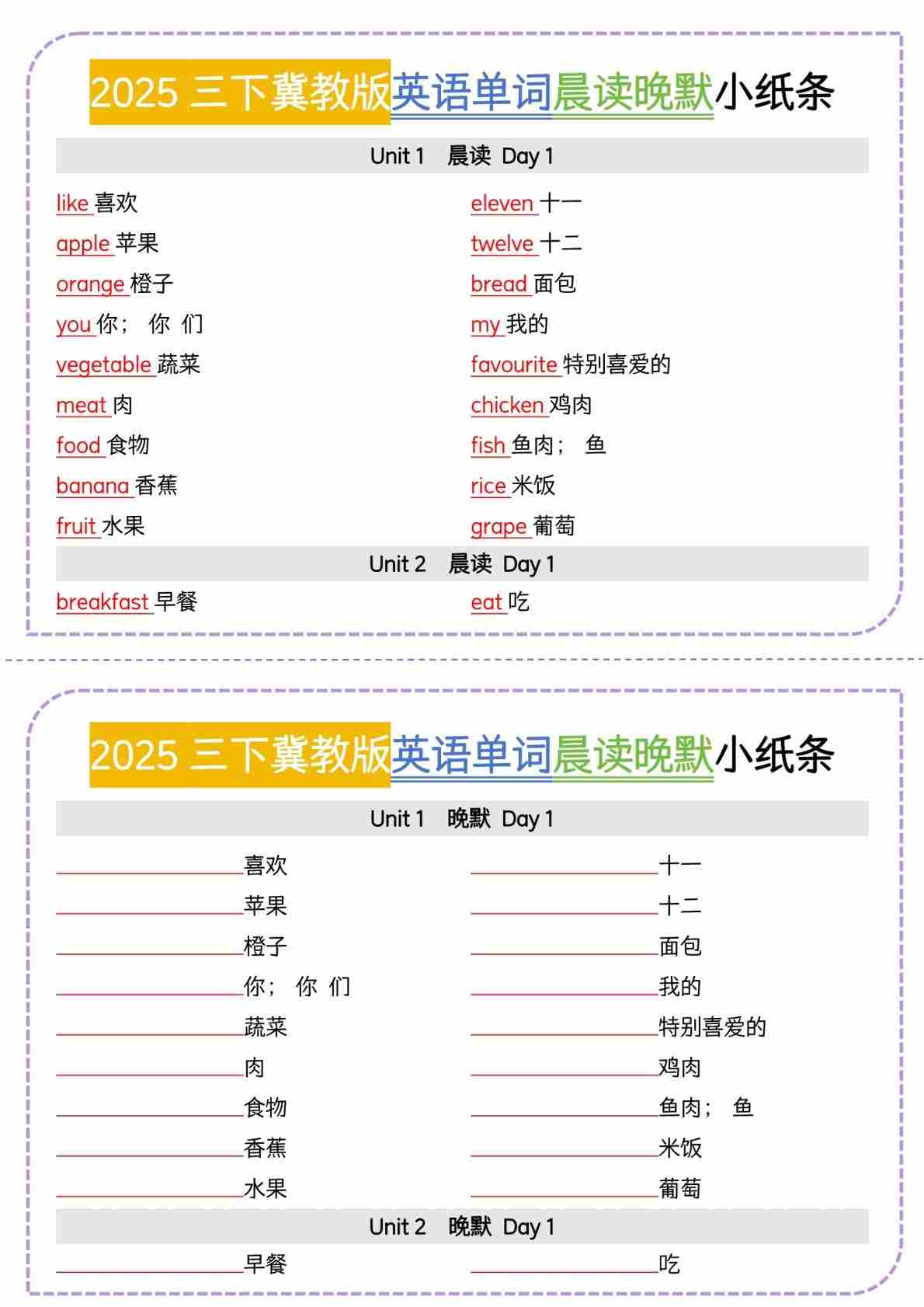 三(下)英语新冀教单词晨读晚默小纸条
