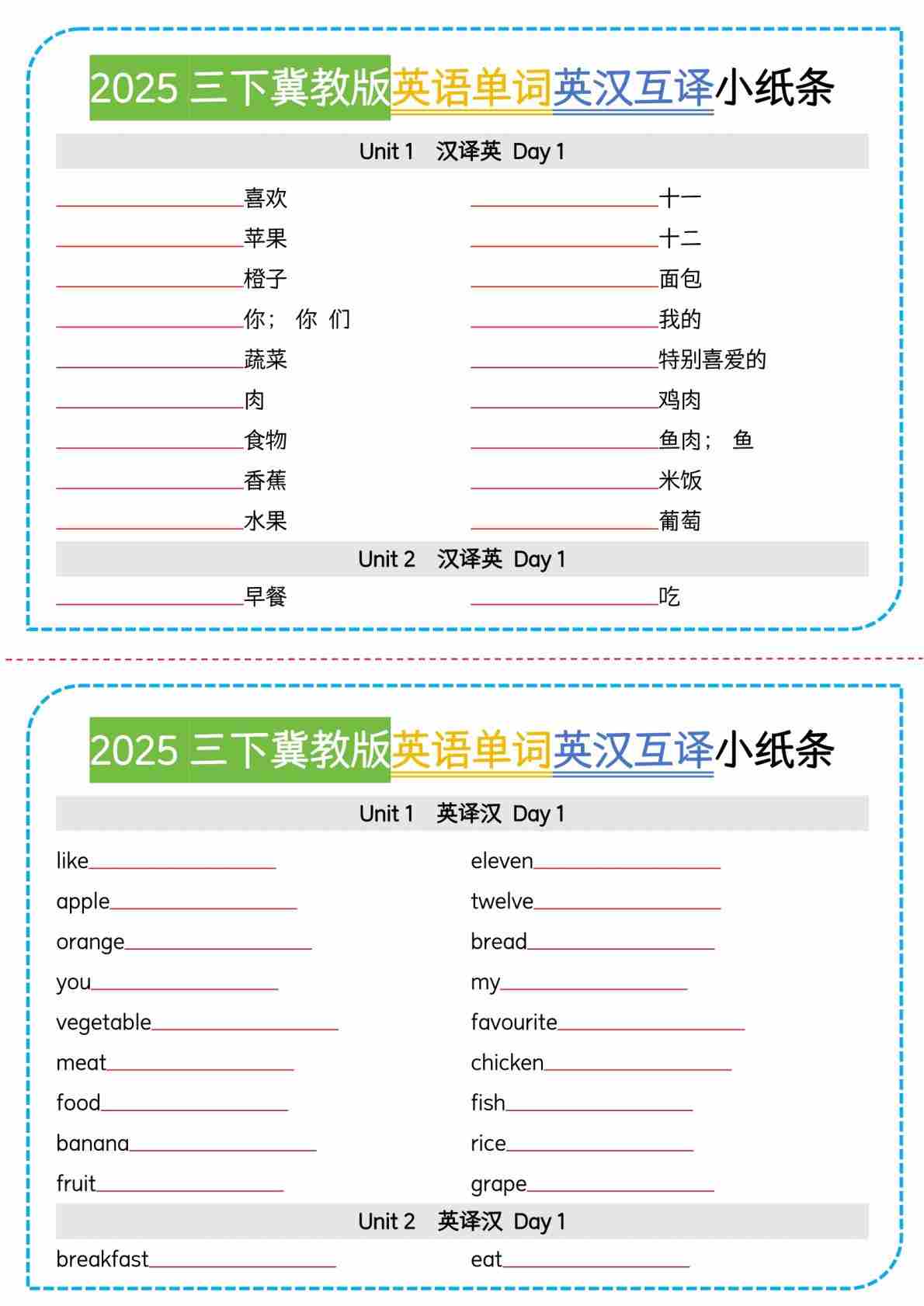 三(下)英语新冀教单词英汉互译小纸条