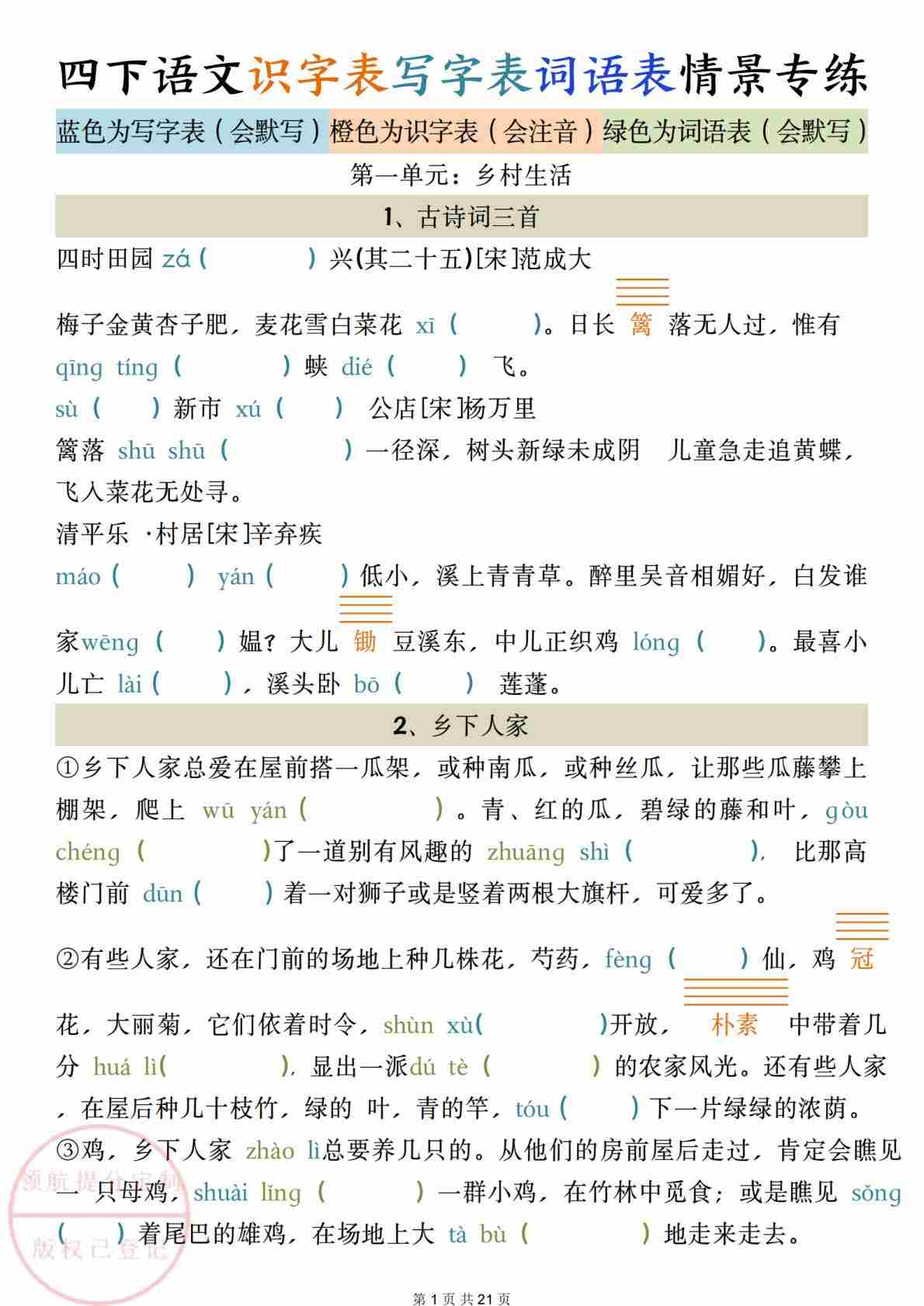 四(下)语文【【识字表、写字表、词语表情景专练(三表合一)】
