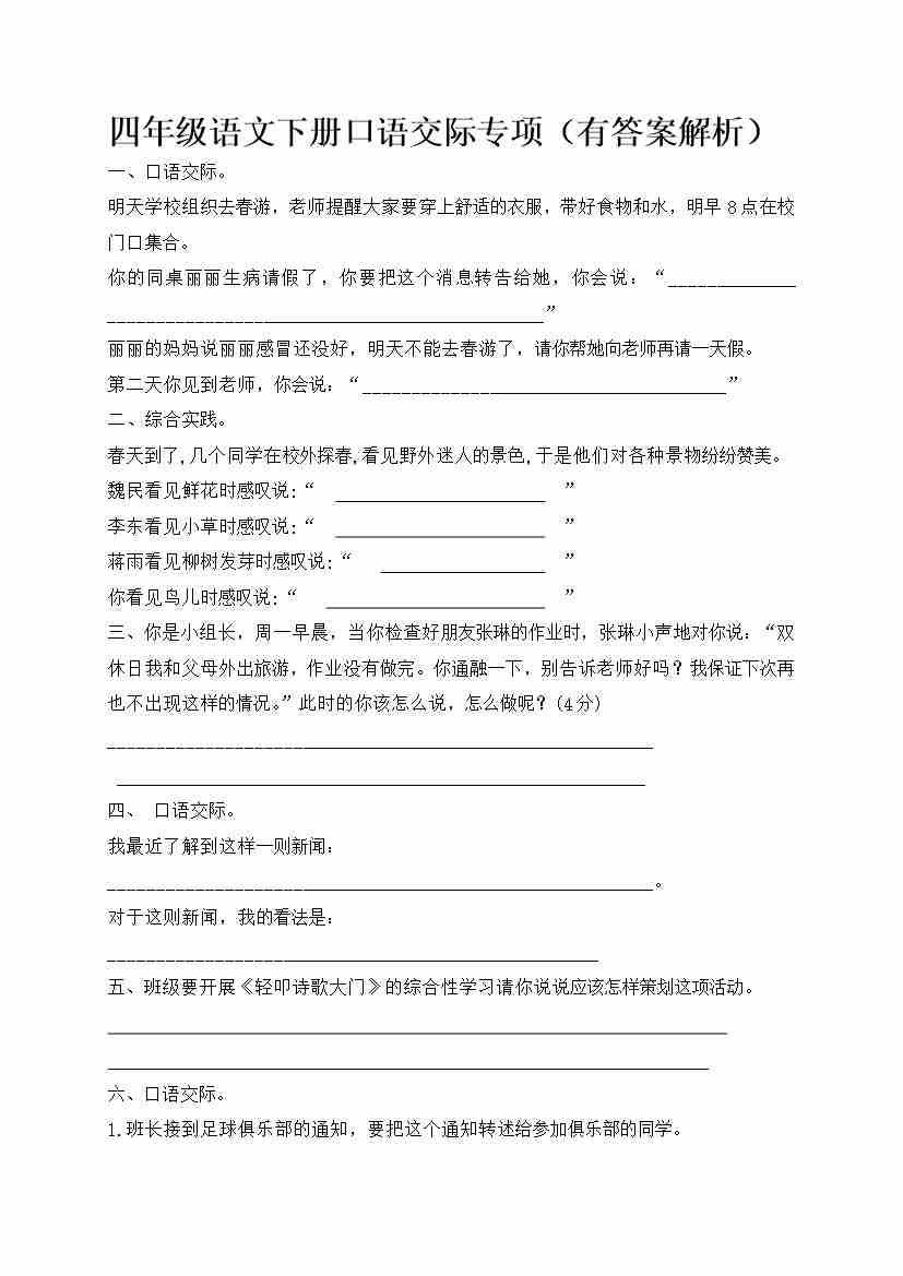 四(下)语文【口语交际专项训练(有答案解析)】