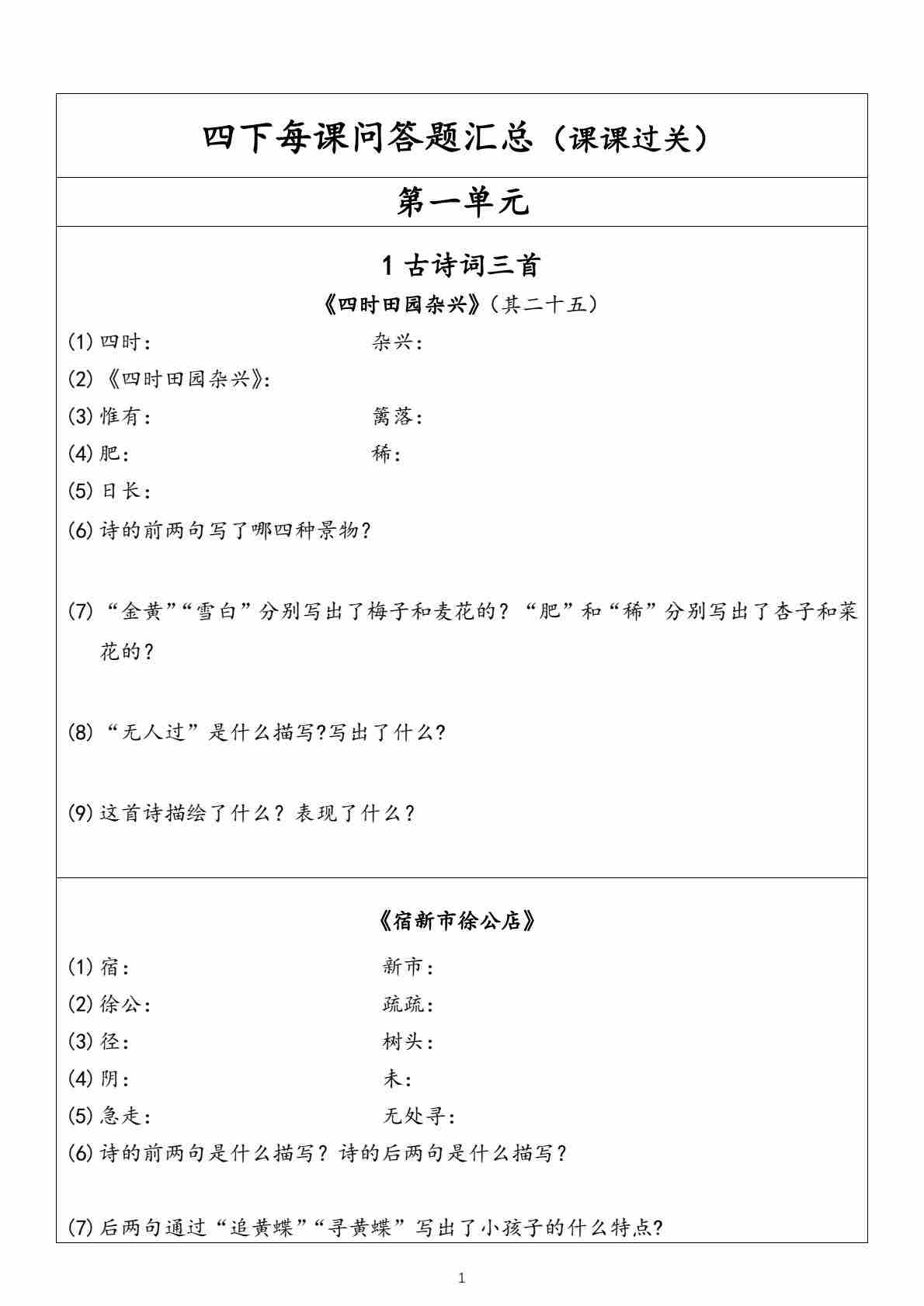 四(下)语文【每课问答题汇总(第1单元)】