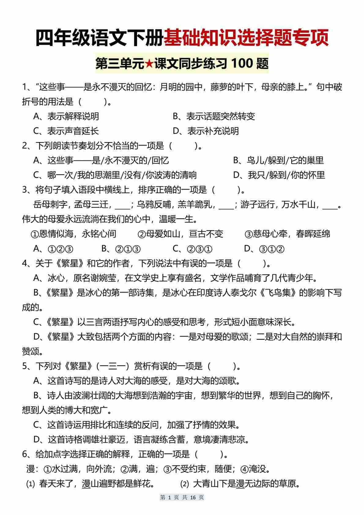 四(下)语文【第一单元基础知识选择题专项(100题)】