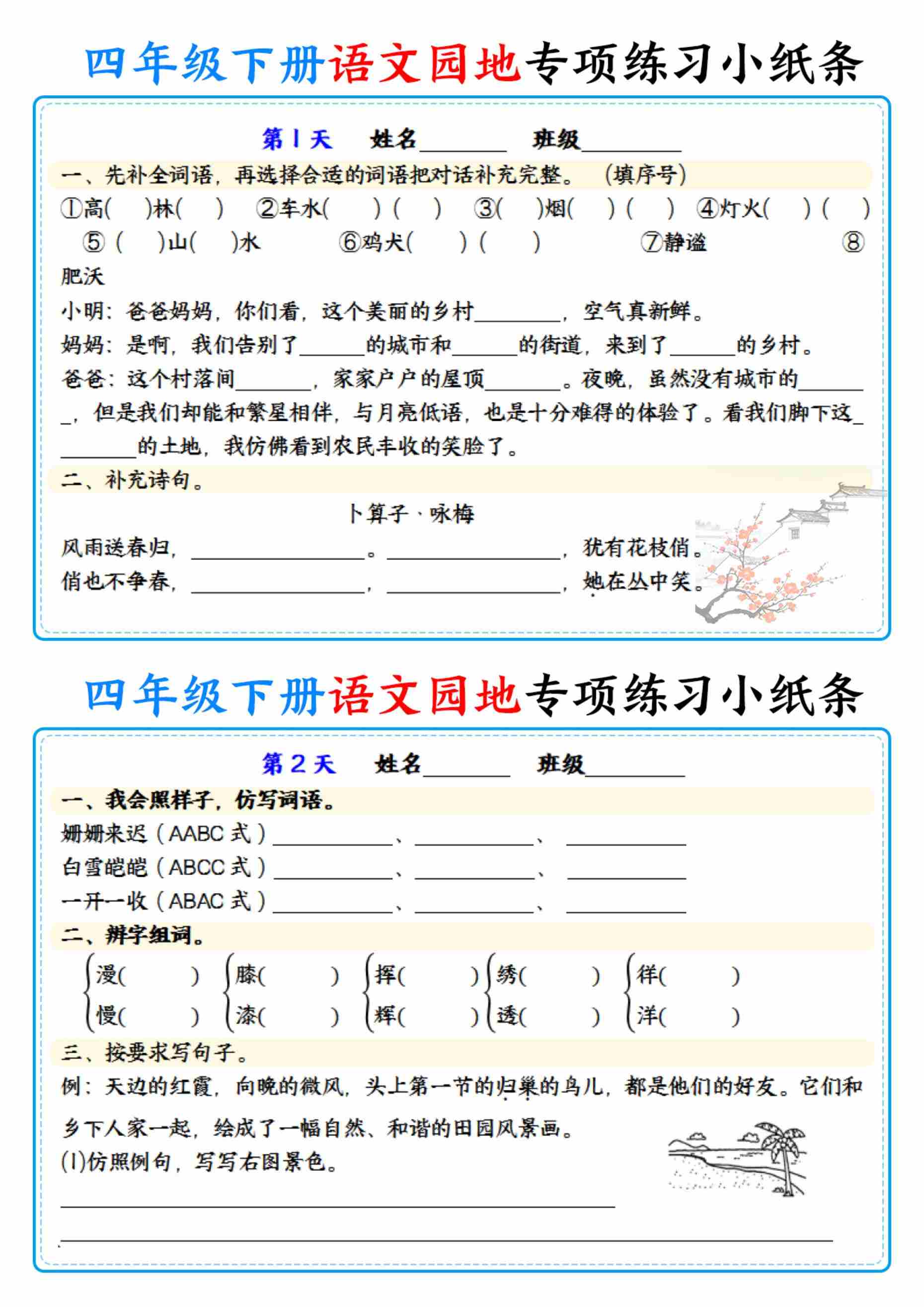 四(下)语文每日词语句子背诵默写单-含答案