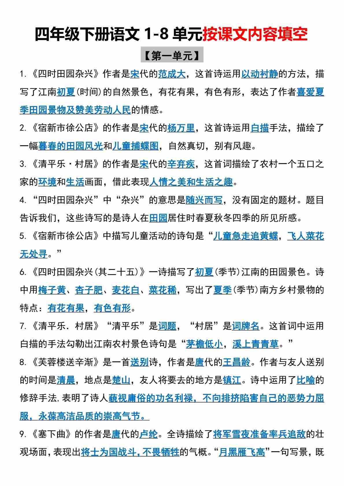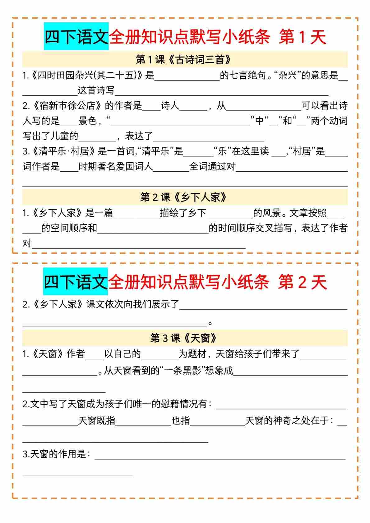 四(下)语文全册知识点默写小纸条