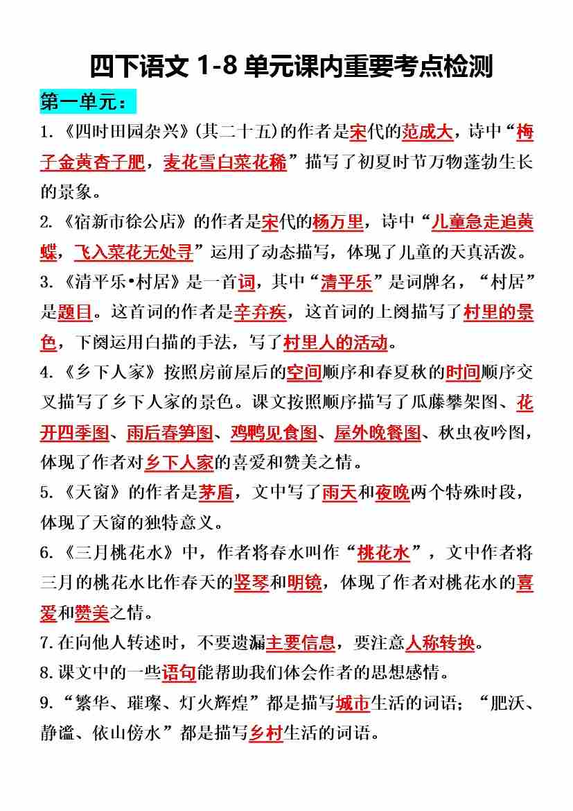 四年级下册语文1-8单元课内重要考点检测
