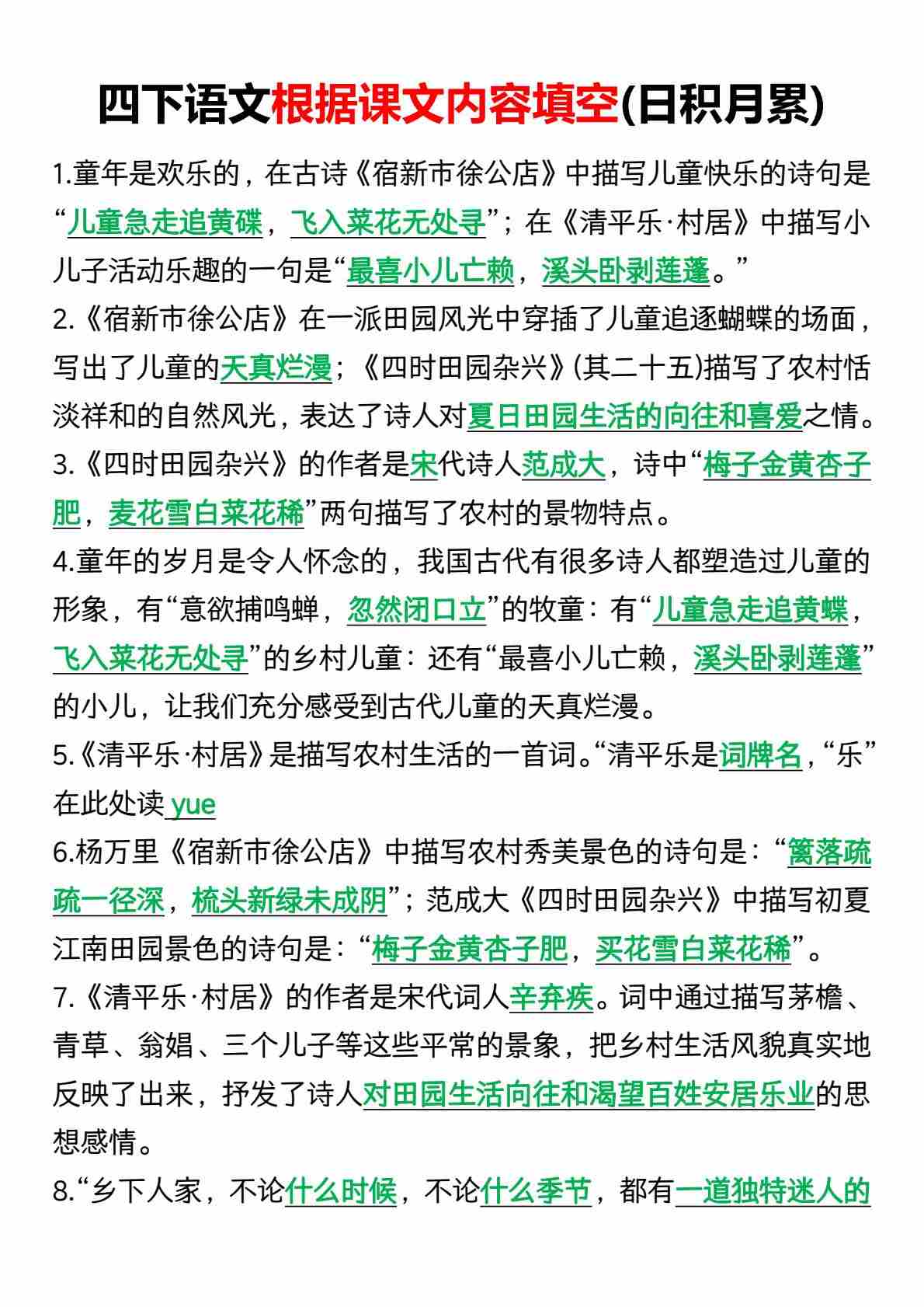 四年级下册语文按课文内容填空(日积月累)