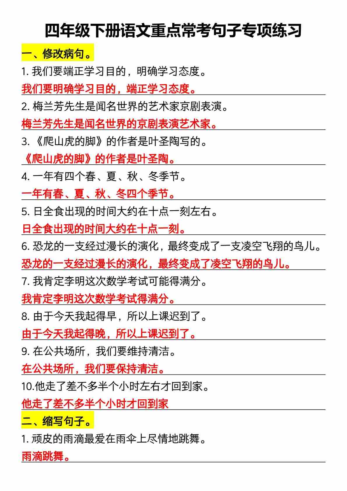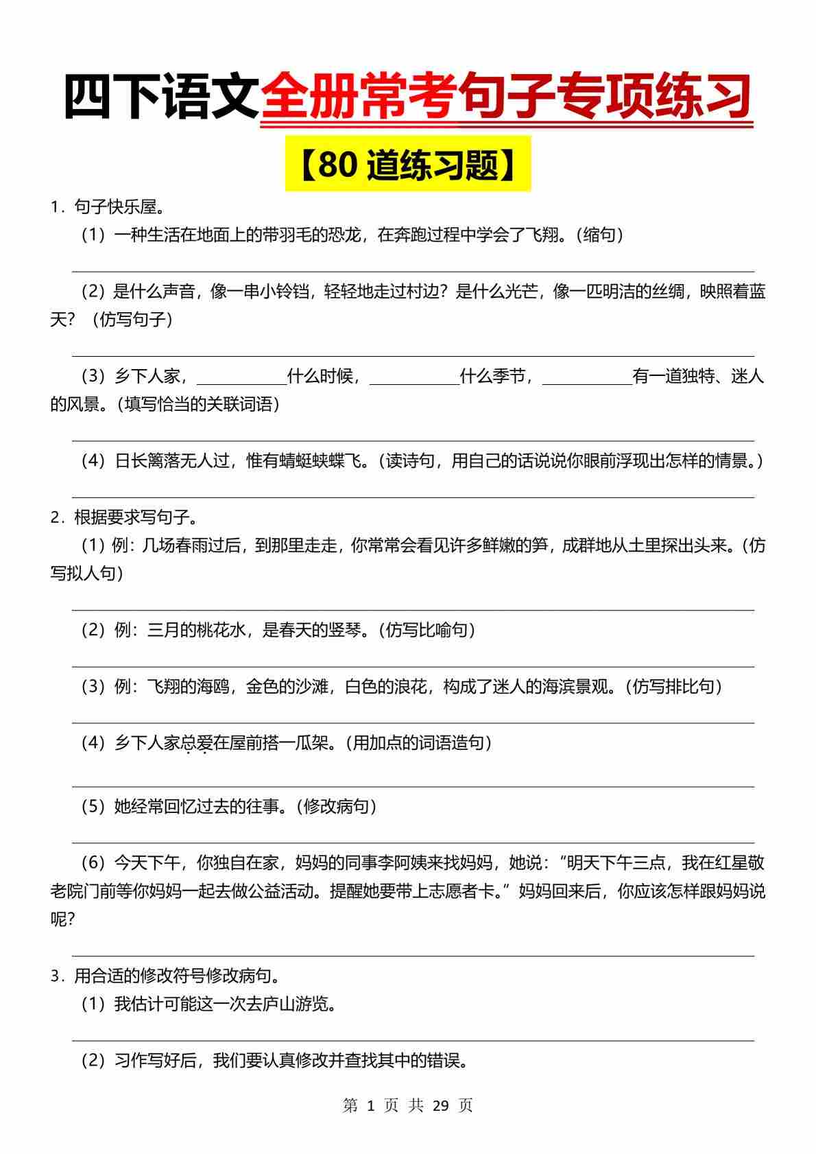 四(下)语文【全册常考句子练习(80道)】