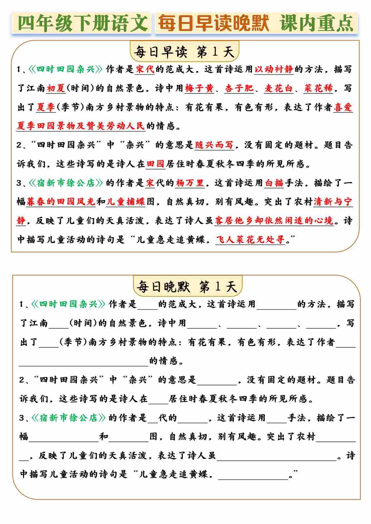 四(下)语文全册课内重点早读晚默每日一练14天