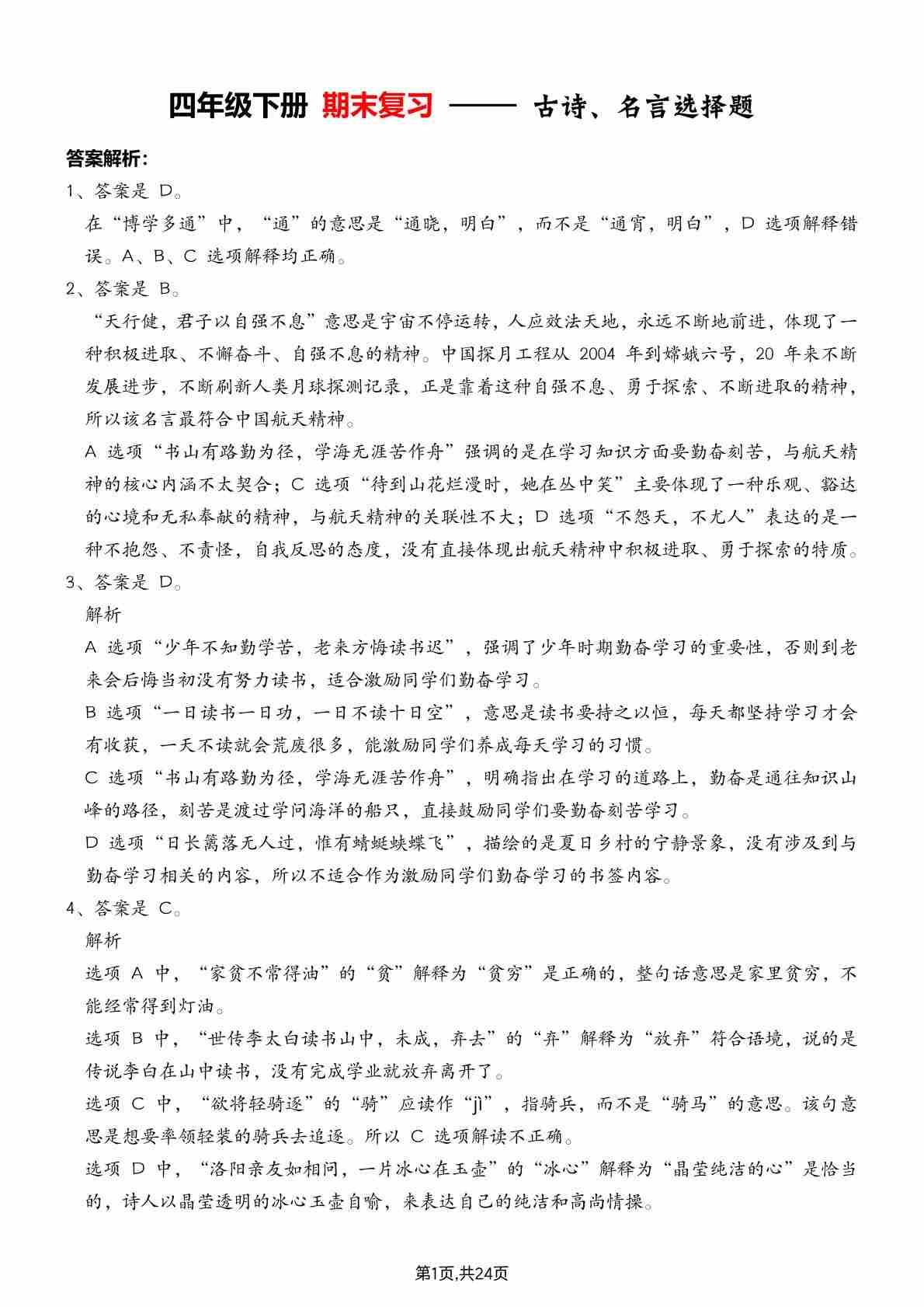 四(下)语文【期末专项练习-综合选择题(答案)】