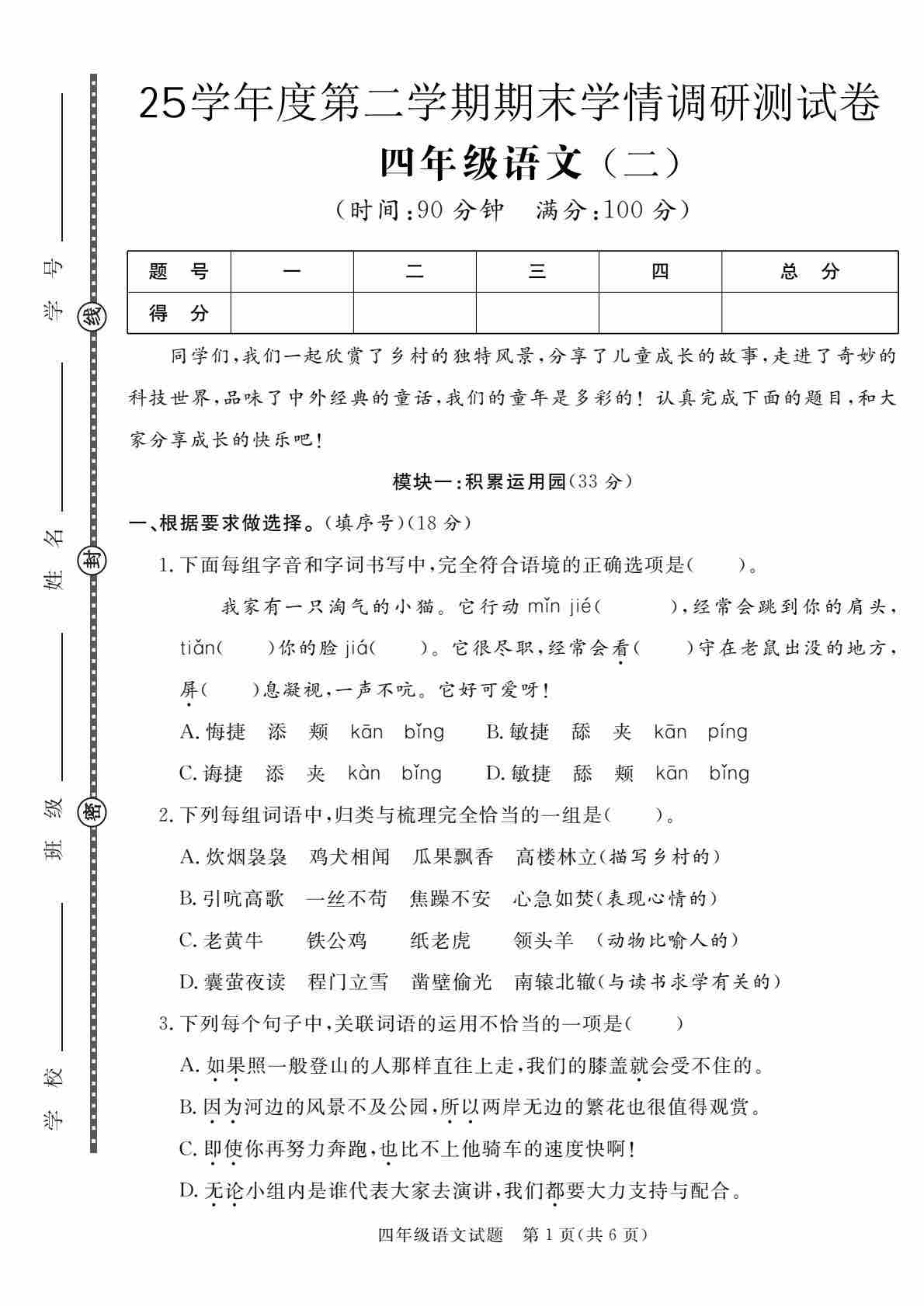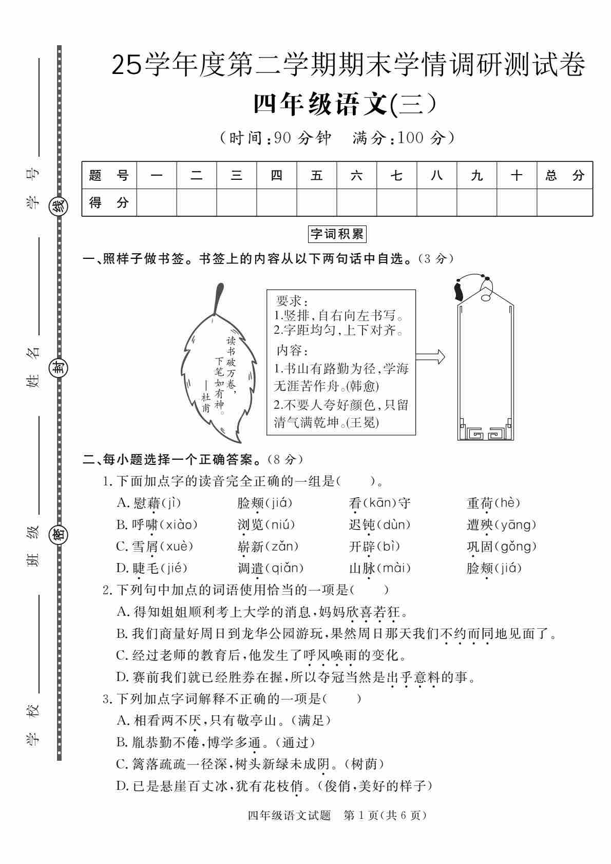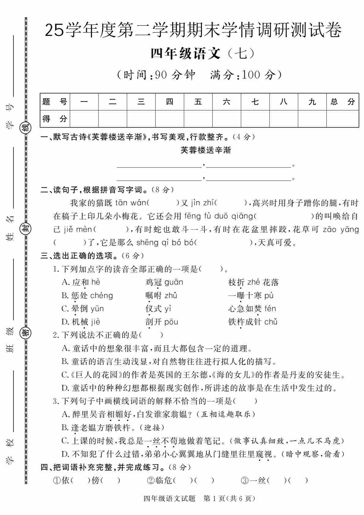四(下)语文【25学年度第二学期期末学情调研测试卷6】
