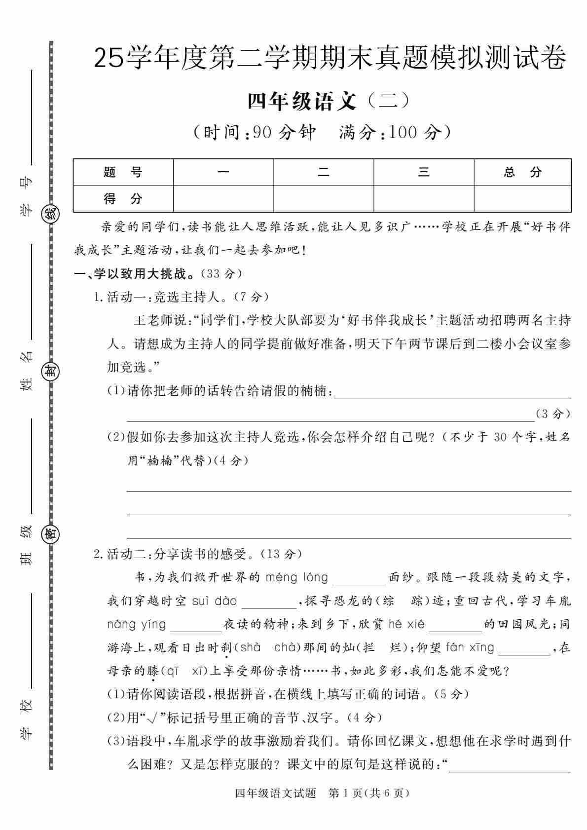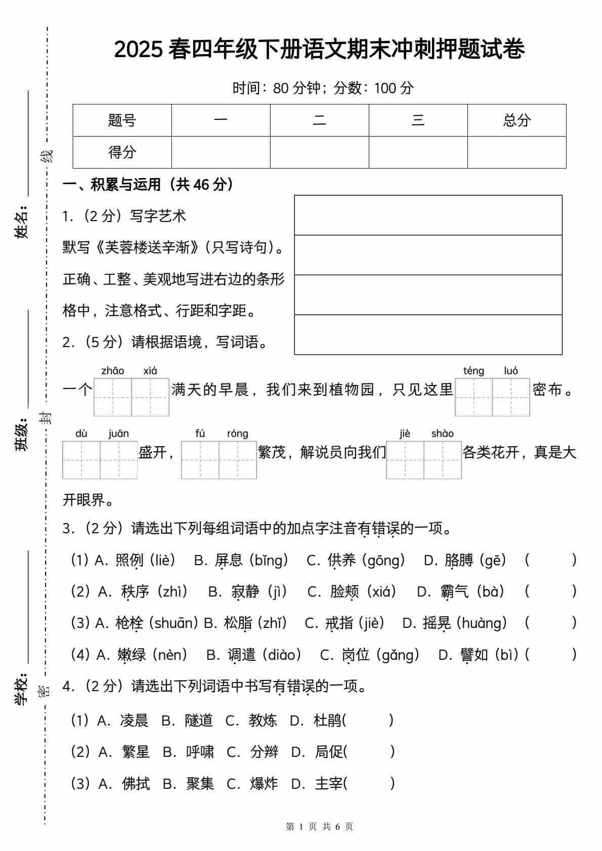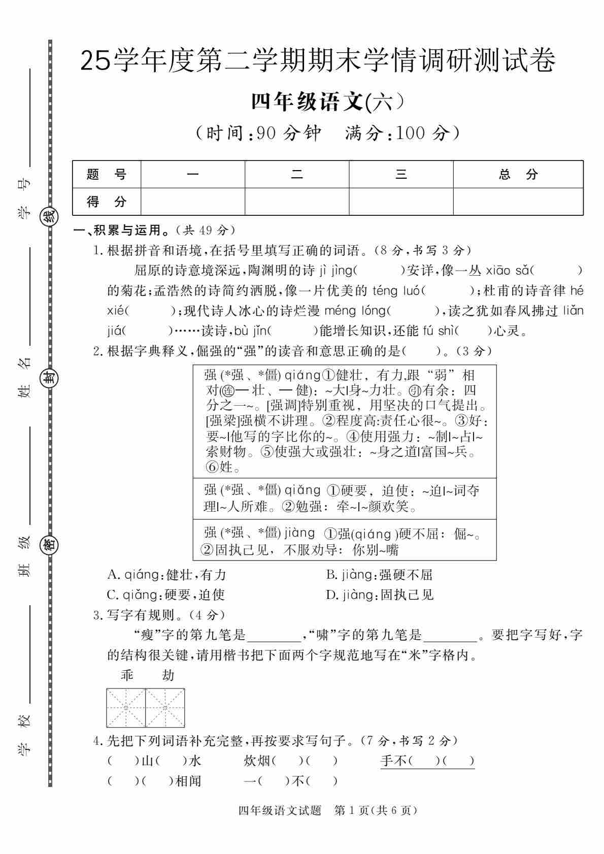 四(下)语文【25学年度第二学期期末学情调研测试卷6】