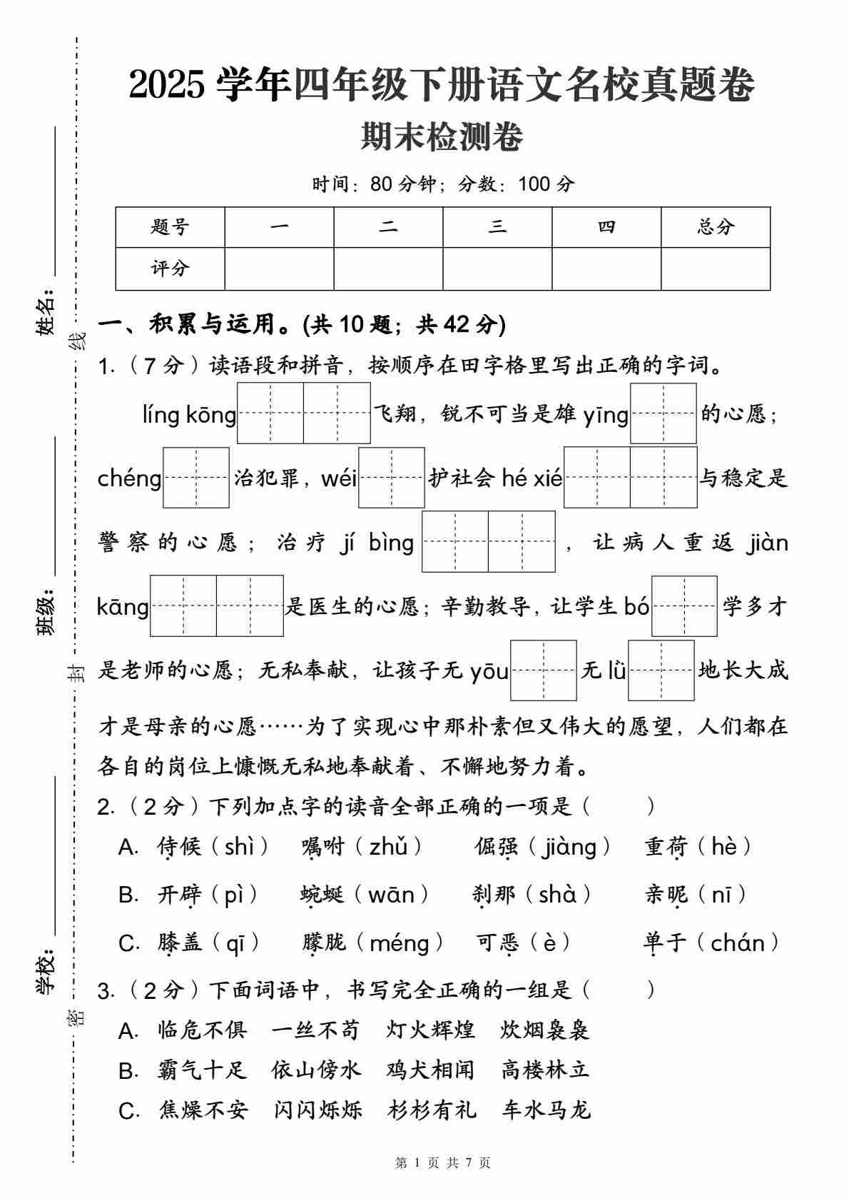 四(下)语文【25学年度第二学期期末学情调研测试卷7】