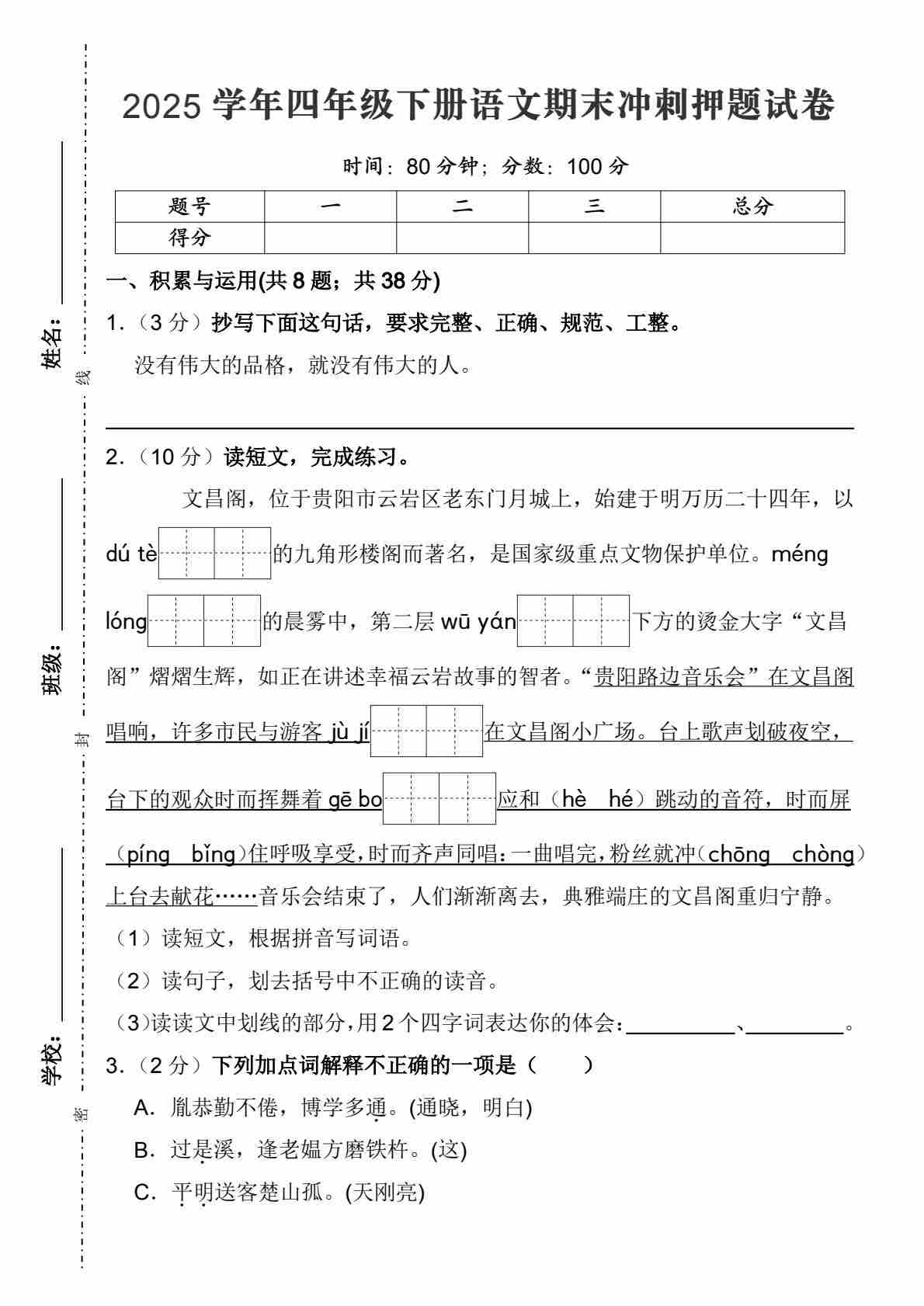 四(下)语文期末冲刺押题试卷(三)