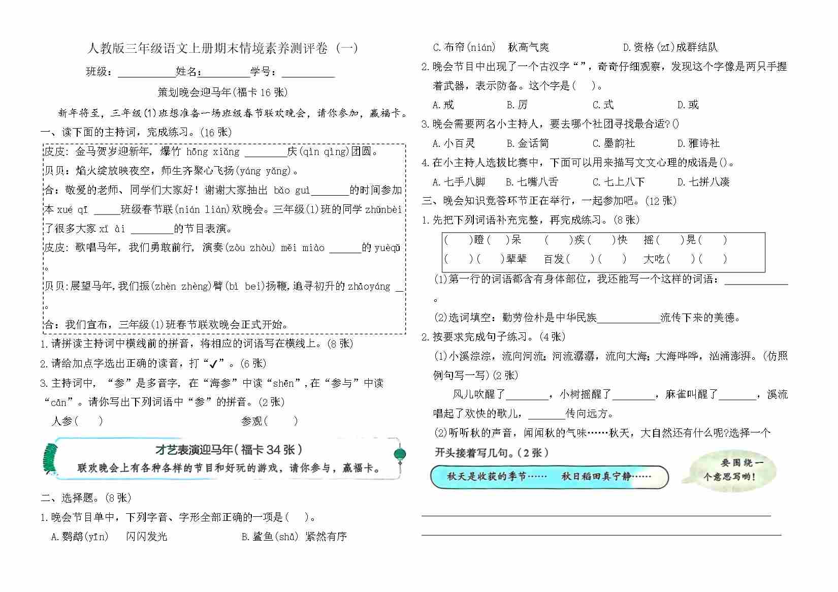 三上语文期末情境素养测评卷 (一)(含答案)