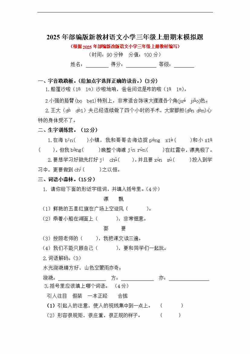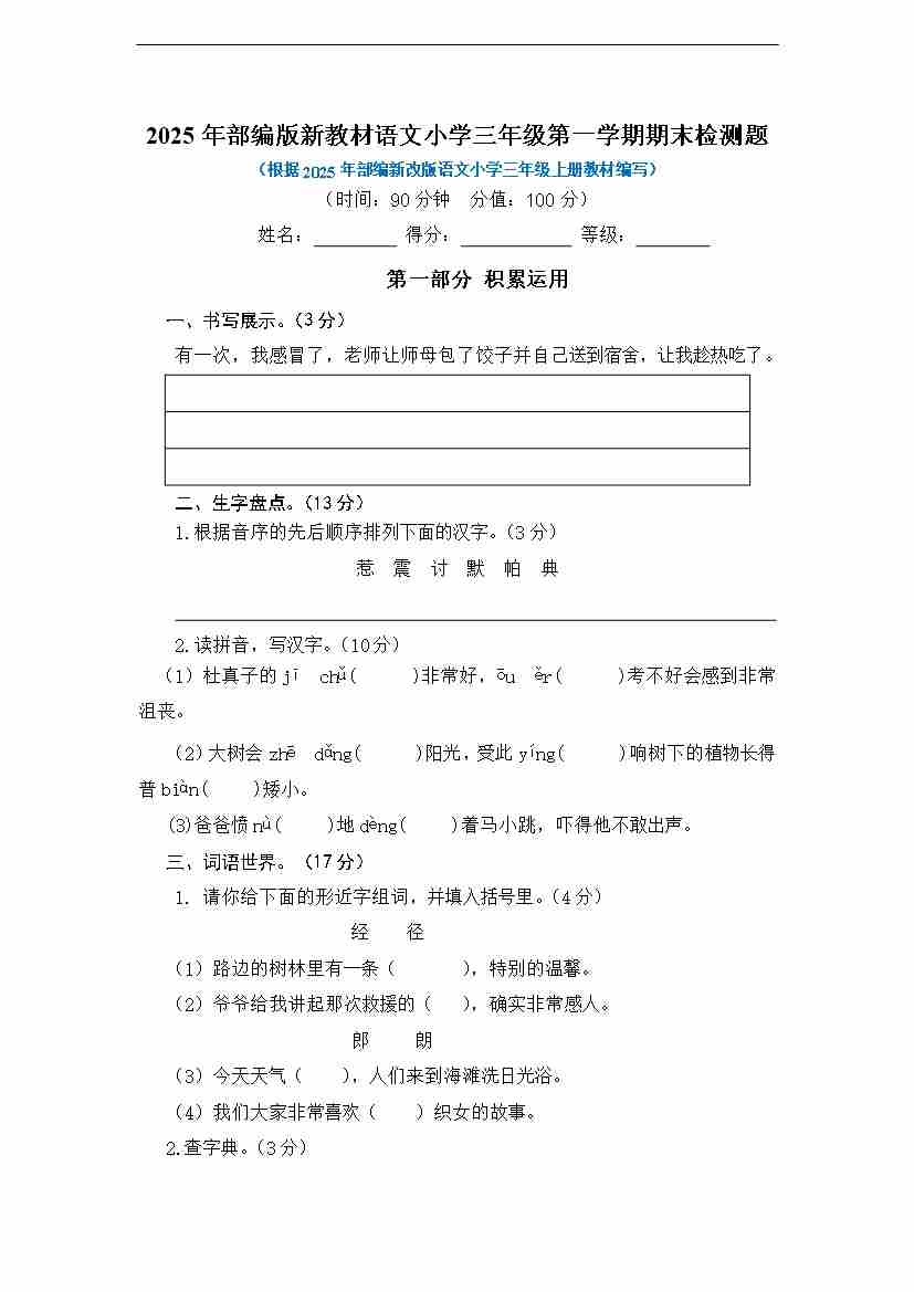三上语文第一学期期末检测题(有答案)