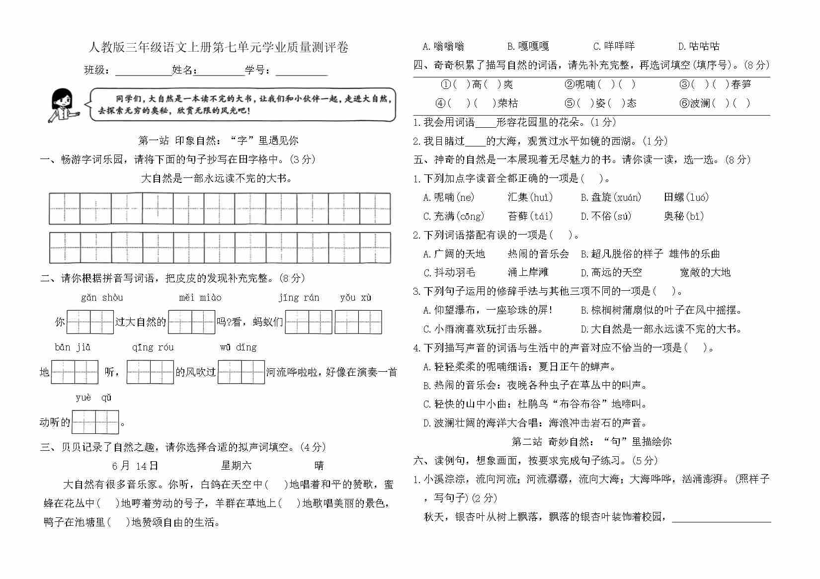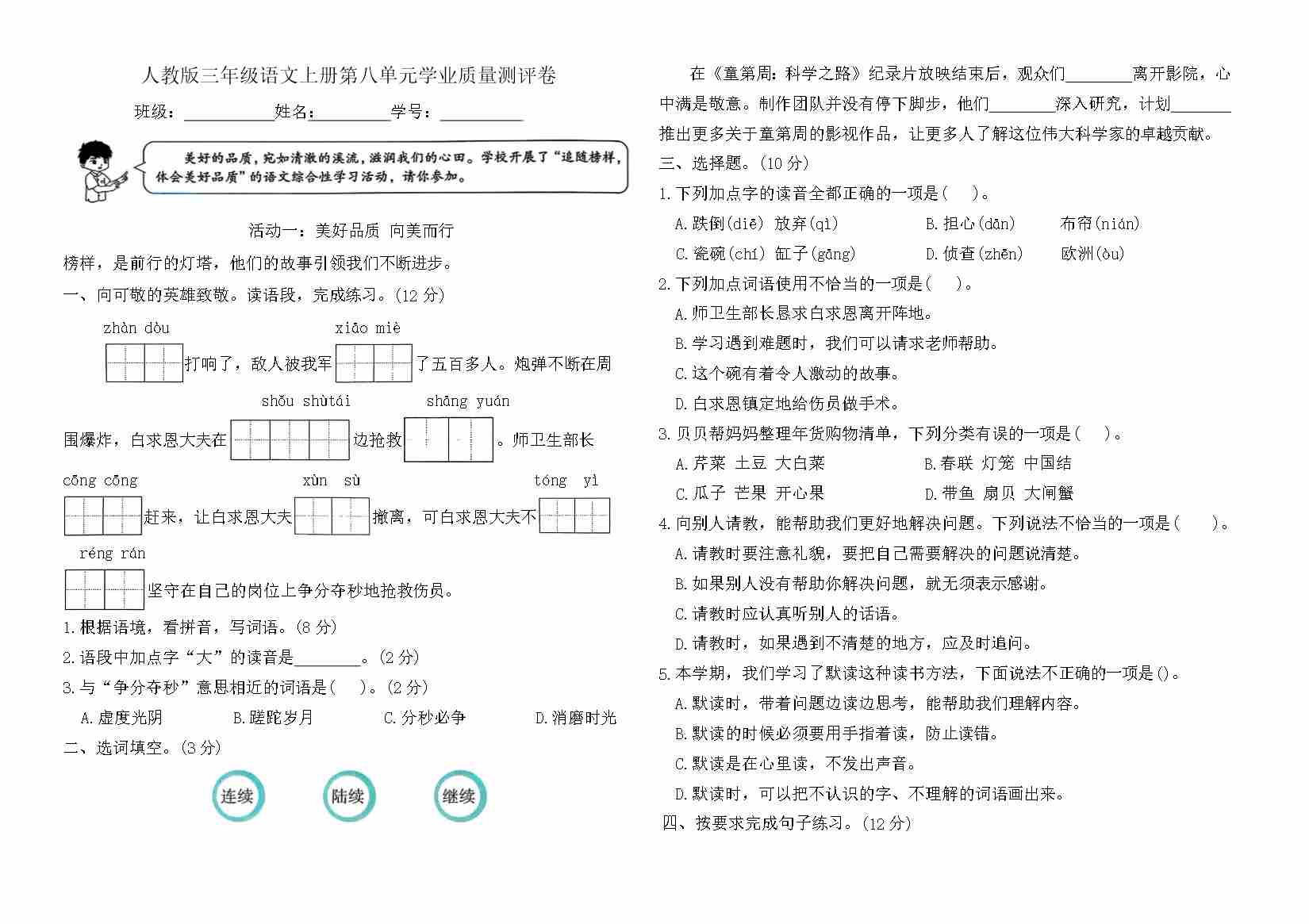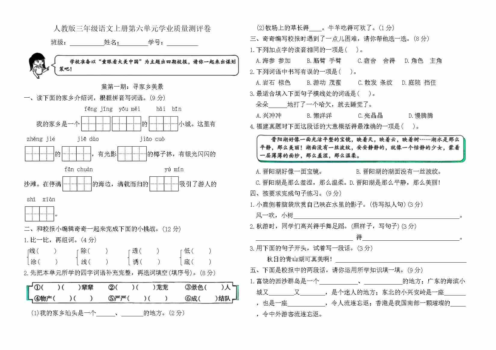 三上语文期中情境素养测评卷(含答案)