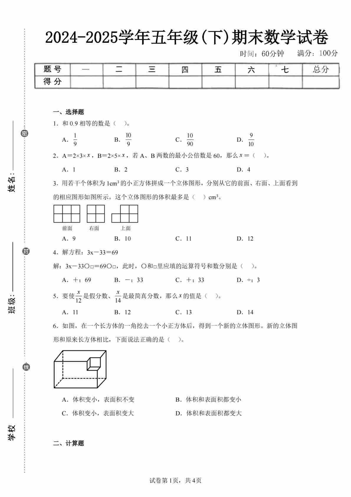 24-25五下青岛63数学期末试卷二(含答案14页)