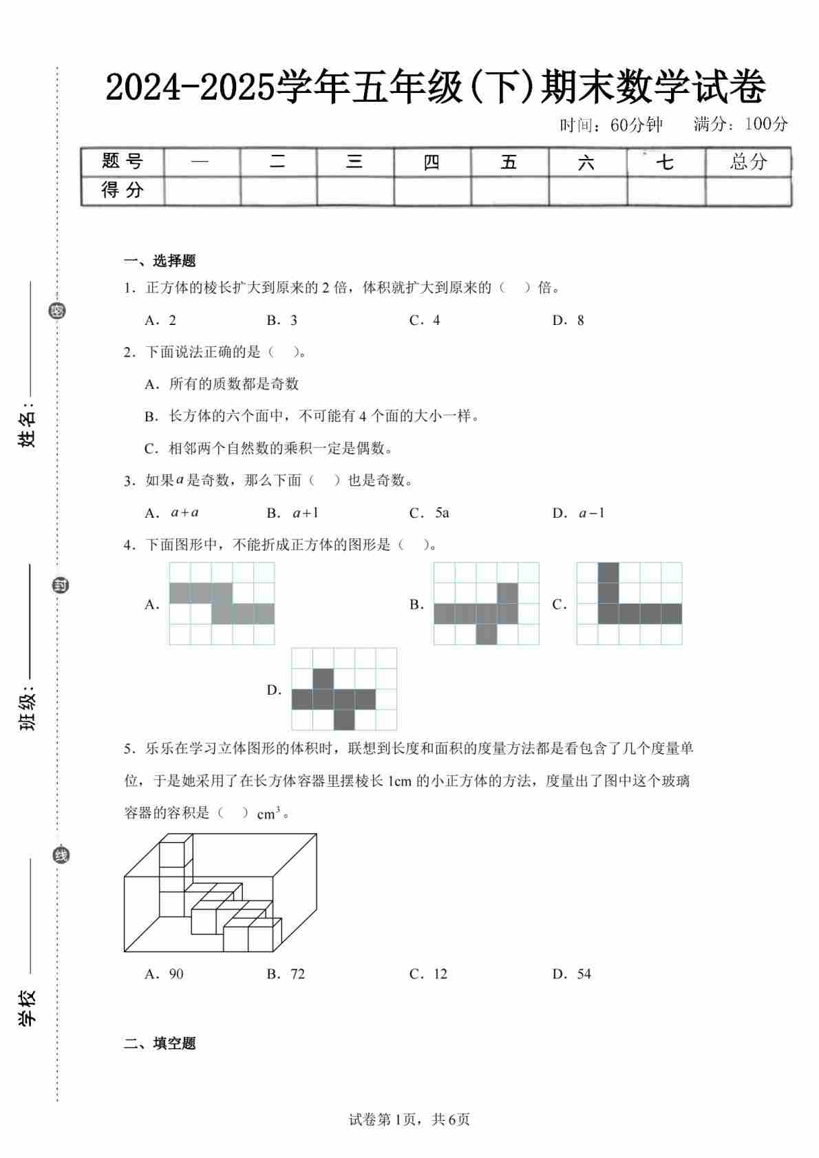 24-25五下青岛63数学期末试卷一(含答案15页)