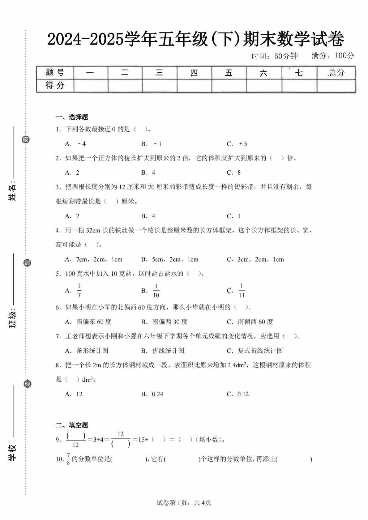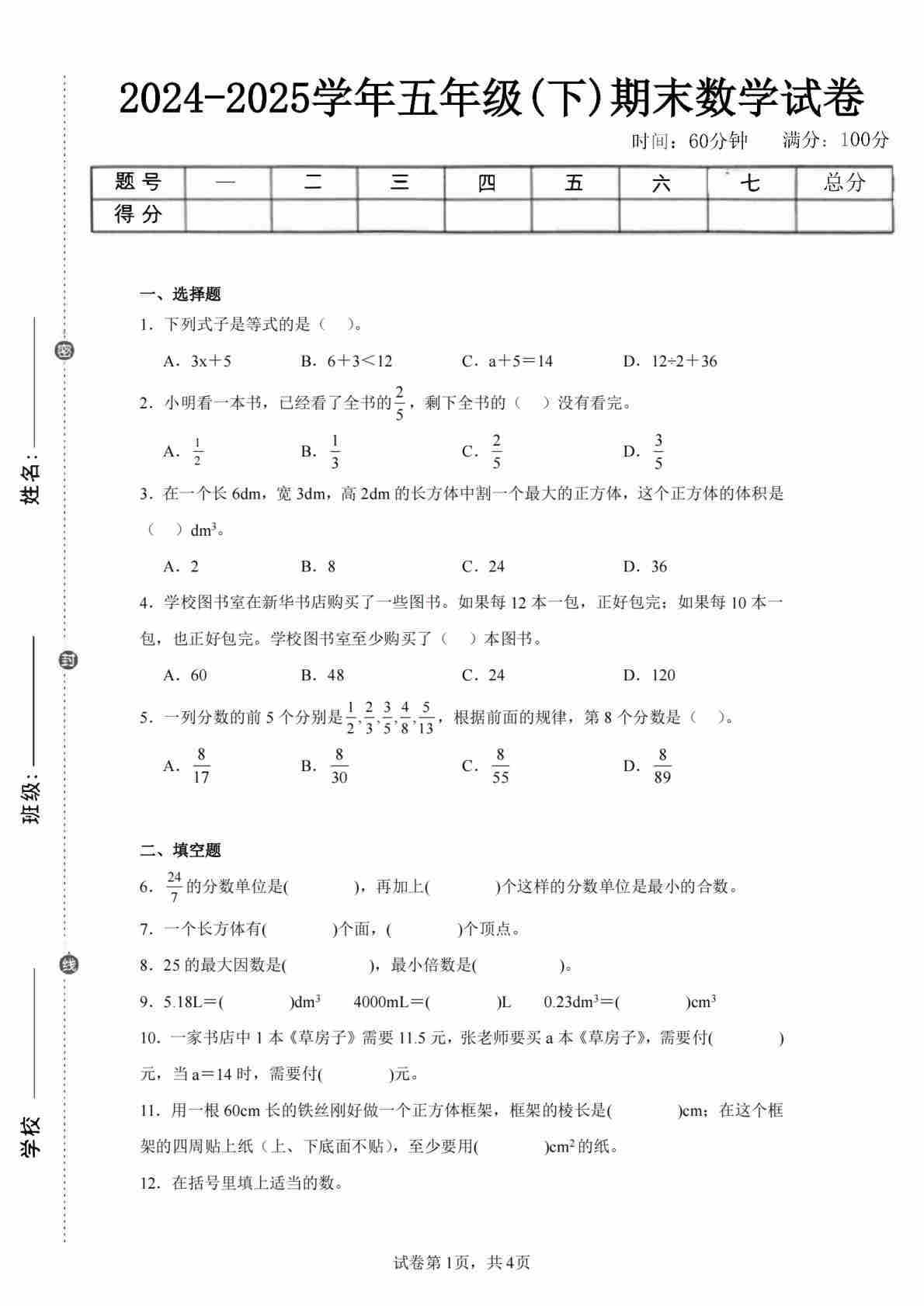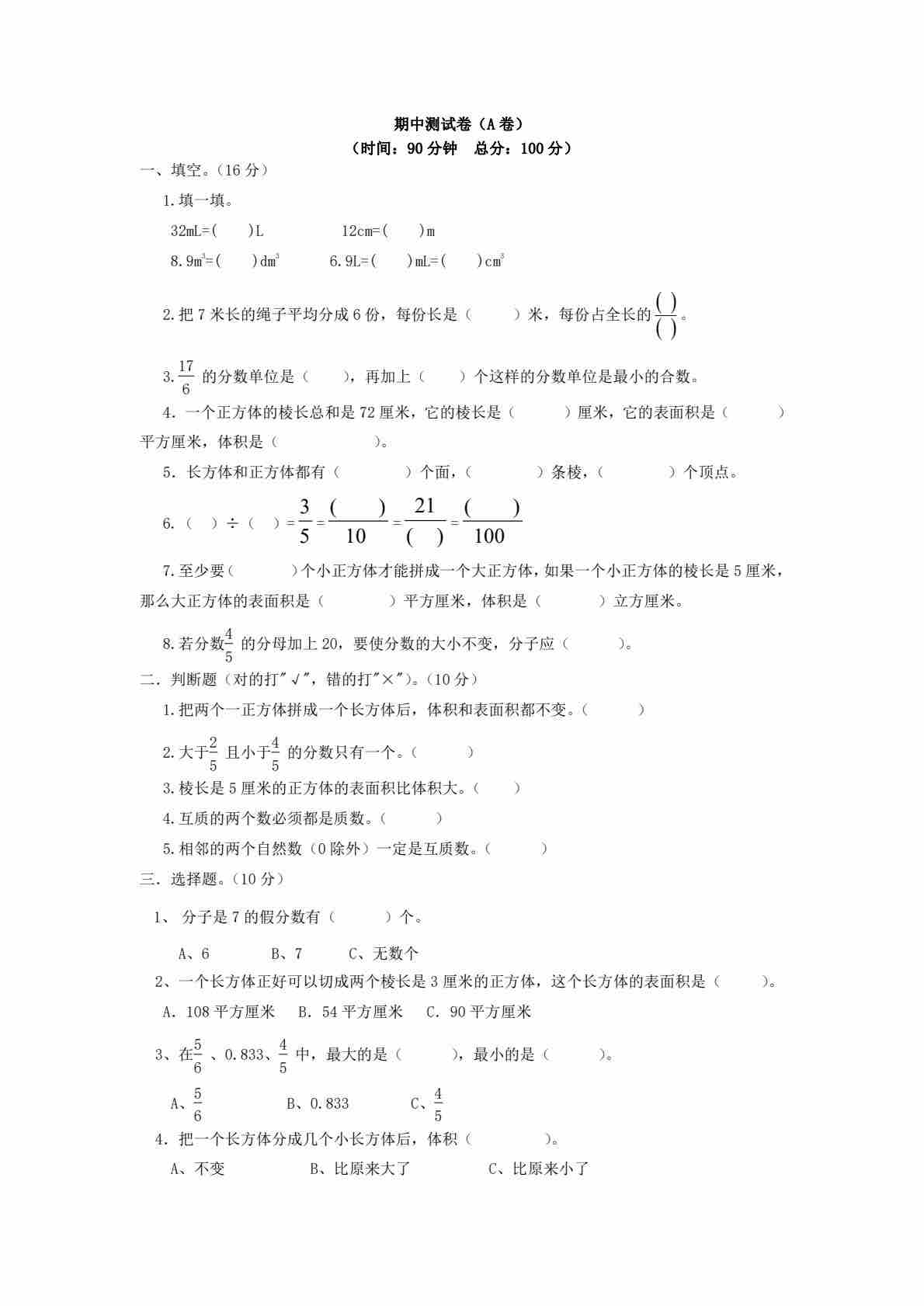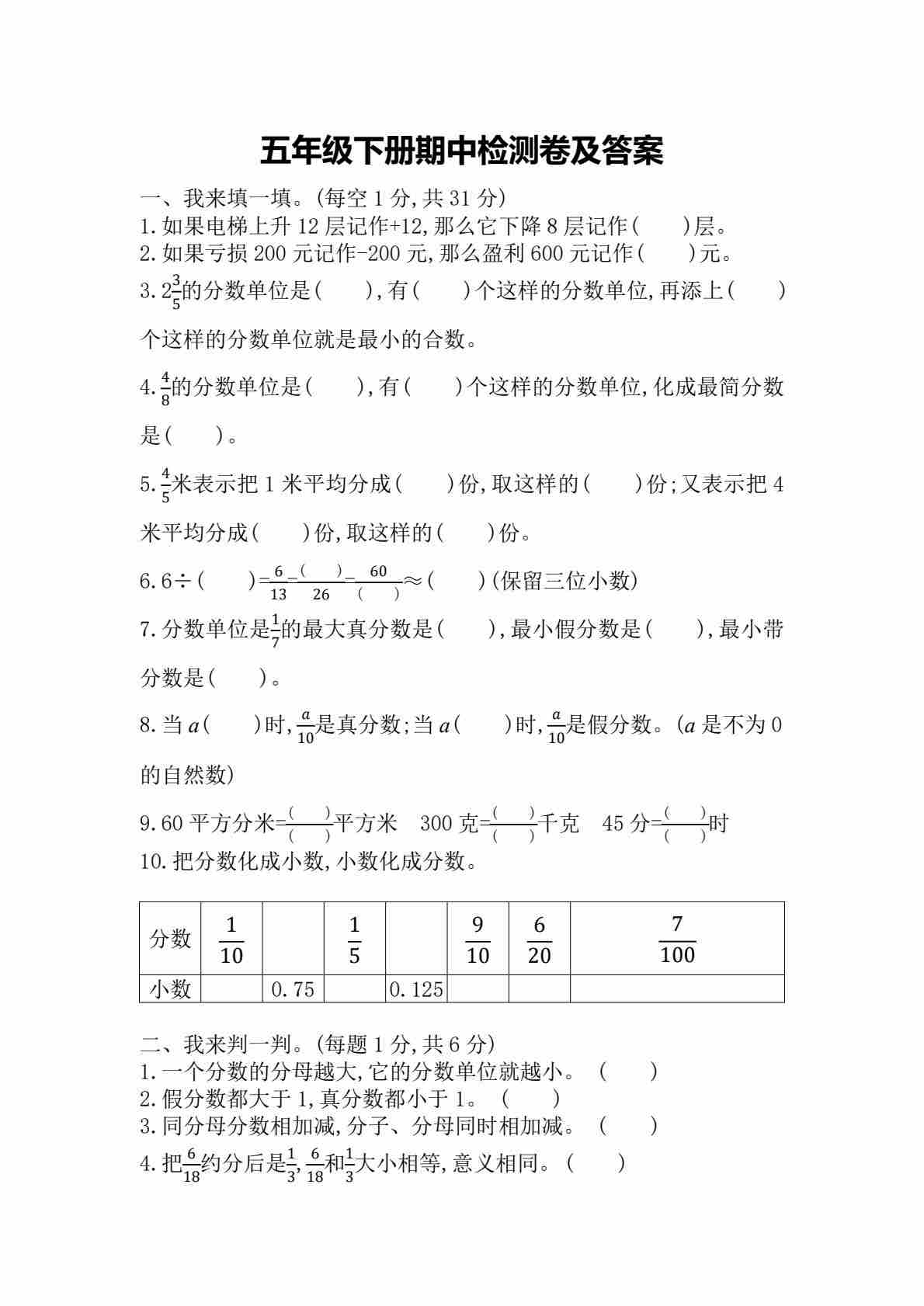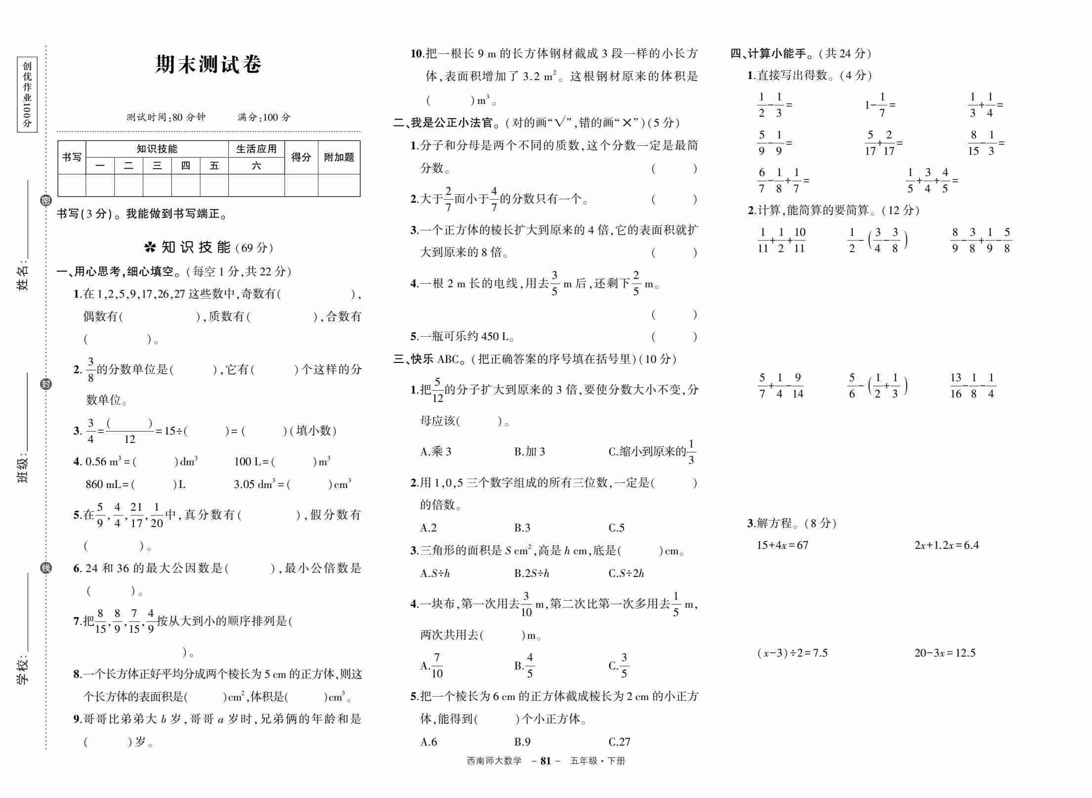 五下西师数学期末测试卷(空白