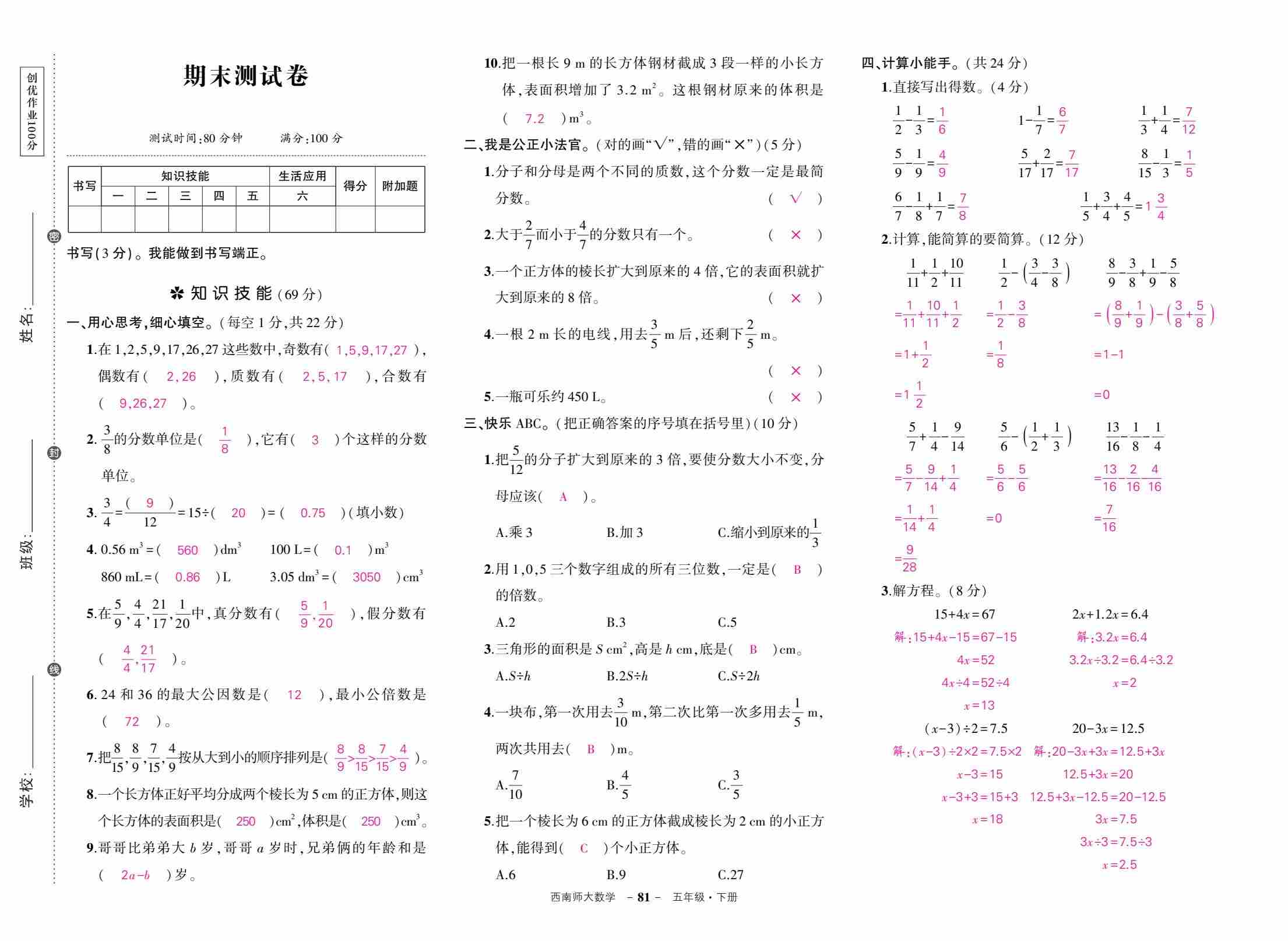 五下西师数学期末测试卷(答案