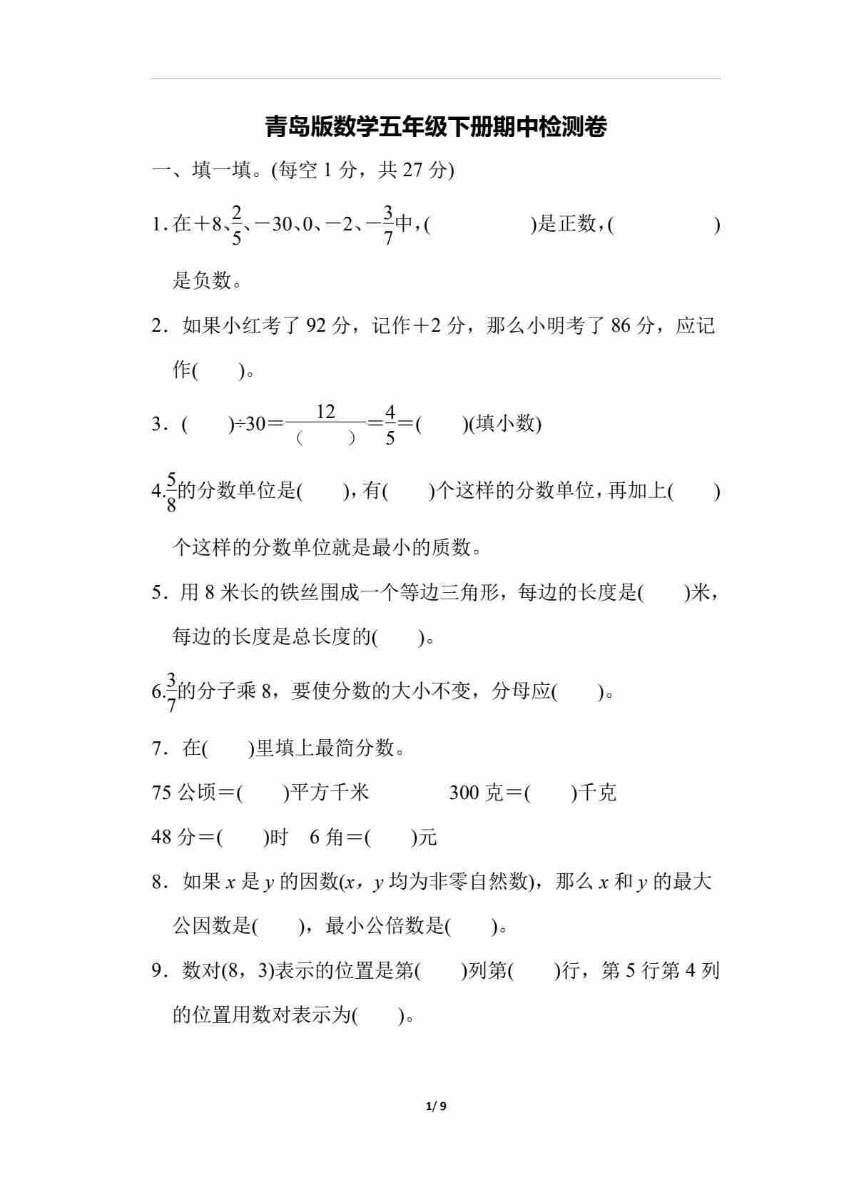 五下青岛六三制数学【期中测试卷.3】
